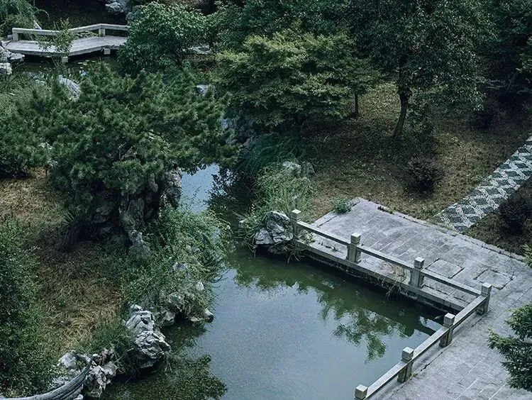 青瓦白墙,庭院内小溪潺潺、假山嶙峋