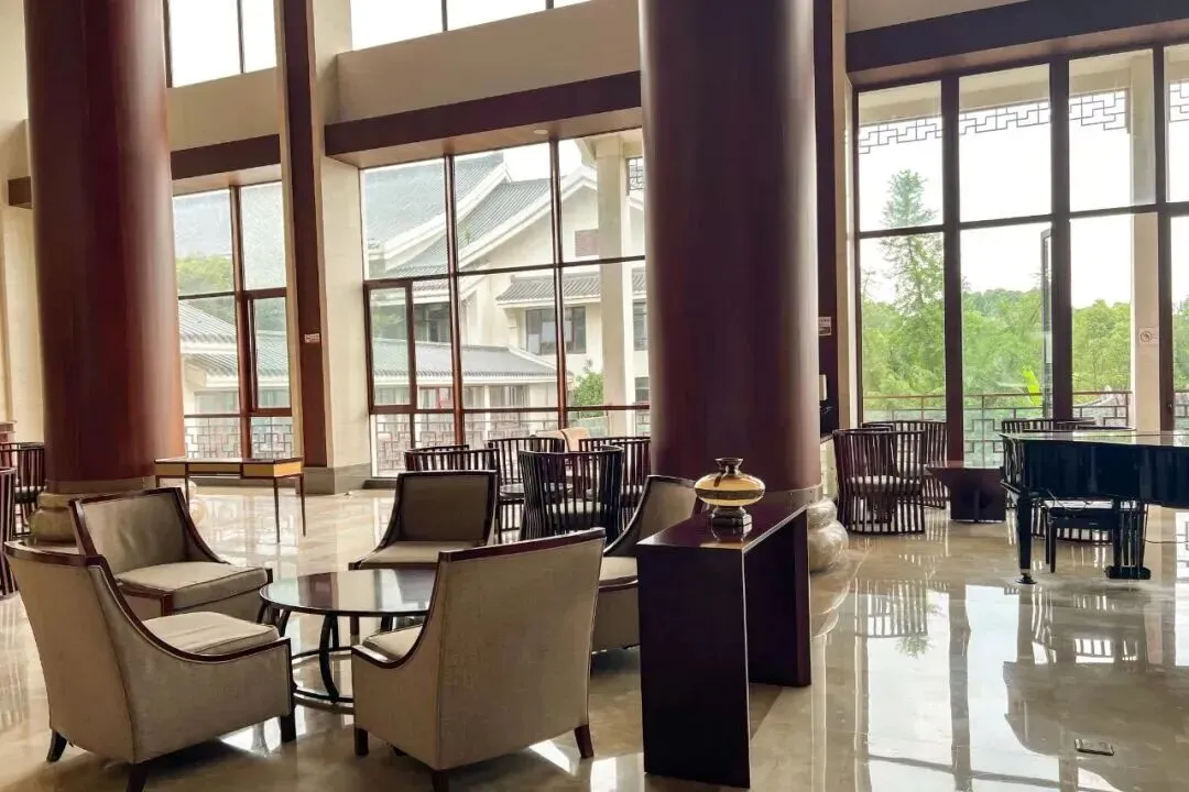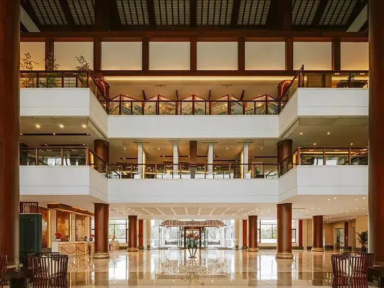 步入酒店大堂,度假风扑面而来,大堂3层挑高视觉格外开阔;中式风屋顶,高大红木立柱,融合苏式园林艺术风,尽享中国古典雅致韵味。