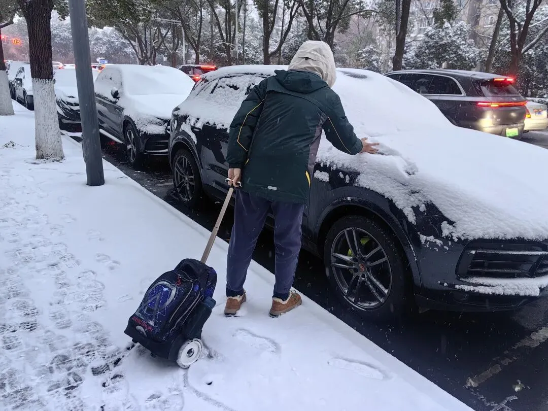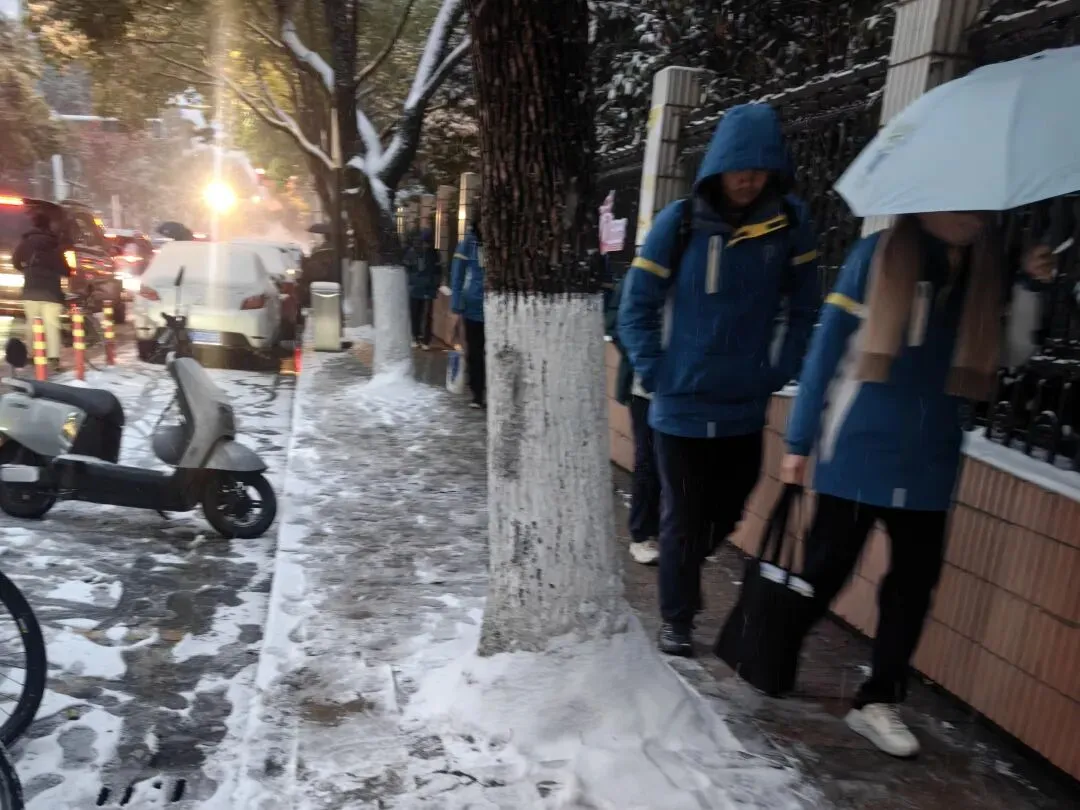 “下雪了,南京下雪了!” 推开窗,天空中的雪花正漫天大舞,整个金陵城瞬间变得温柔起来。 学校就在家附近,看着这鹅毛大雪,哪里还坐得住?“走,上学去!”拉上孩子,一头扎进了这白色的童话里。 01 呲溜一下,上学路变成了“探险路” 刚出电梯大门,还没走两步,“呲溜”一下,我就小试牛刀,结结实实滑了一下。 这给了我一个“下马威”,于是立刻警惕起来,变成了“企鹅步”。一路上,地上已经有了深深浅浅的脚印。我一边护着孩子,一边传授“雪天行走秘籍”: “崽啊,专踩没踩过的白雪!那雪松软,形状不规则,摩擦力大,不容易滑。你看那些被踩过的,都成了‘冰坨子’,那是陷阱!” 孩子一路担心迟到,紧赶慢赶,我却忍不住掏出手机,记录下这匆匆的背影。平时5分钟就能搞定路程,今天足足走了10分钟。虽然慢了点,但这跌跌撞撞的上学路,倒也成了难得的回忆。 送完孩子,回家的路上,我终于慢悠悠地欣赏起这美丽的雪景。 迎面走来的孩子们,一手拎着手提袋,一手打着伞,脚下像跳芭蕾一样,小心翼翼地试探;有的把校服帽子戴上,两手插在口袋,悠闲地踱步,放下了平时急急忙忙的节奏。 过马路时,居然不用像平时那样急着闯红灯,因为红绿灯路口的汽车也不敢冒失,大家都变得温吞吞、慢悠悠。 弯曲的小径配上一连串的脚印,真是一幅别样的美景。 公园里的花坛罩上了美丽的白衣,最有趣的是那群树。一棵大树侵着身子,向着周围的一群小树,好像在给它们开晨会,传授过冬的经验;而不远处,竟有两棵“情侣大树”,它们手拉着手,互相拥着,互相取暖,似乎正在低声诉说着绵绵情话。 连树叶子也偏爱这雪景,张开手掌,任这层层叠叠的大雪落在手心,稳稳托住。 这雪,高兴了孩子,也高兴了植物。它们终于可以躲在大雪底下,干自己想干的一切事务。 快要迟到啦!这是一位高三的学生,平时应该是压力最大、步履最匆忙的人群。可今天,我看到他从爸爸的车上下来,竟然直接兴奋地奔向路边那簇全新的雪衫。 那一刻,他不再是埋头刷题的高三生,而是一个可爱的小孩子。他掬一捧雪在手心,脸上洋溢着纯粹的快乐。 我也仿着他,将手指拢向那堆白雪。指尖触碰之处,一阵凉意,但并不感觉冷,只感觉很快乐! 大概这就是雪天的魔力吧,它能让成人卸下铠甲,让忙碌停摆片刻。 回到家楼下,小区的保安大哥已经开始了清扫雪层的工作。他们弯着腰,一点点铲出一条方便行人的路。 虽然天冷,但心里热乎乎的。给他们点赞!它让路滑了,让车慢了,但也让心近了,让景美了。 在这个下雪的日子里,希望你也能慢下来,感受指尖的凉意,和心底那份久违的快乐。 ❄️ 你那里下雪了吗?遇到了什么有趣的事?欢迎在评论区留言分享! ❄️