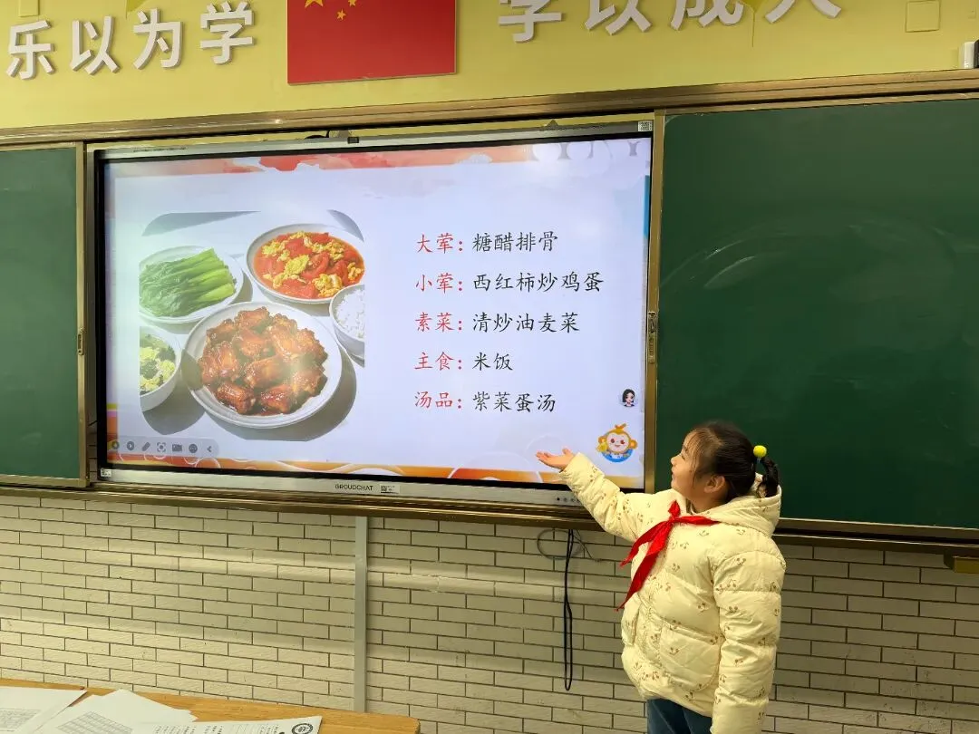 完成菜单的设计后,“营养食谱发布会” 热闹开场!同学们捧着自己设计的食谱,骄傲地介绍:“我的午餐有杂粮饭、清蒸鱼和凉拌菠菜,营养又好吃!” 这些带着 “知识温度” 的食谱,不仅是学习成果,更是同学们健康生活的 “新起点”,让大家真正懂得 —— 知识能实实在在 “解决生活问题”,学习超有用!