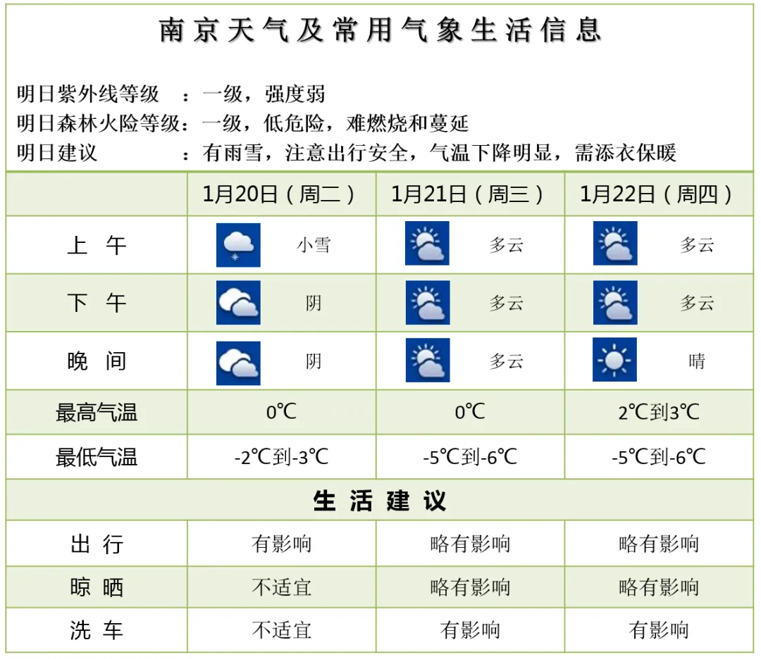 随着寒潮深度南下,雨雪天气将使江南一带迅速转入“湿寒模式”,多地气温可能创下同期新低。南京未来几天将持续低温:本周最低气温都在0℃及以下,20日至24日早晨最低气温仅-3℃到-6℃,有较严重冰冻。周二(20日)和周三(21日)最高气温也仅0℃左右,体感十分寒冷。