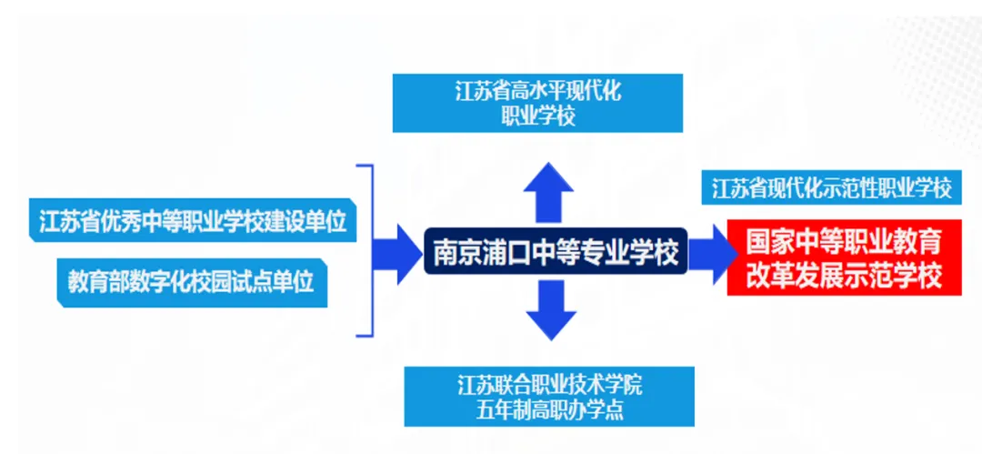 学校是国家中等职业教育改革发展示范学校、国家职业教育信息化标杆学校建设单位、教育部数字化校园试点单位、国家级重点中等职业学校、江苏省优秀中等职业学校建设单位、江苏省四星级中等职业学校、江苏省现代化示范性职业学校、江苏联合职业技术学院浦口中专办学点。