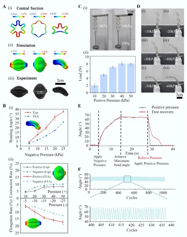 图2. HLA 和 HBA 的性能表征。(A) 在 -25kPa、40kPa(HLA)和 -40kPa(HBA)压强下,HLA 和 HBA 的 (i) 中央截面变形、(ii) 通过有限元(FE)仿真得到的致动器轴向位移及弯曲角度、(iii) 轴向位移和弯曲角度的实验测量结果,以与仿真进行比较。(B) 在负压范围从 0 到 -50kPa(HBA)、10kPa 到 50kPa(HLA,正压)、-5kPa 到 -25kPa(HLA,负压)条件下,比对有限元仿真与实验得到的 (i) HBA 的弯曲角度、(ii) HLA 的伸长和收缩率。(C) (i) 三串联 HLA 在 50kPa 压强作用下提升 100g 重物;(ii) 3串联HLA在 10kPa 到 50kPa压强条件下的承载能力。(D) 3串联HBA在驱动压强从-10kPa到-60kPa下的弯曲变形。(E) HBA在施加正压和自由回弹下的恢复速度比较。(F) HBA的无负载循环测试(超过1000次循环)。