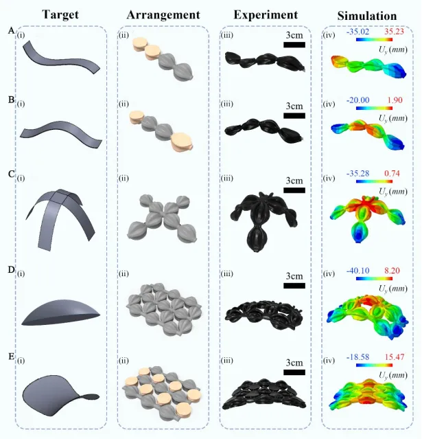 图3. HBA实现的各种结构形状。S形(A (i) 到 (iv))、Ω形(B (i) 到 (iv))、四爪形(C (i) 到 (iv))、圆顶形(D (i) 到 (iv))和马鞍形(E (i) 到 (iv))结构的目标形状、HBA的排列、实验结果及有限元模拟结构。