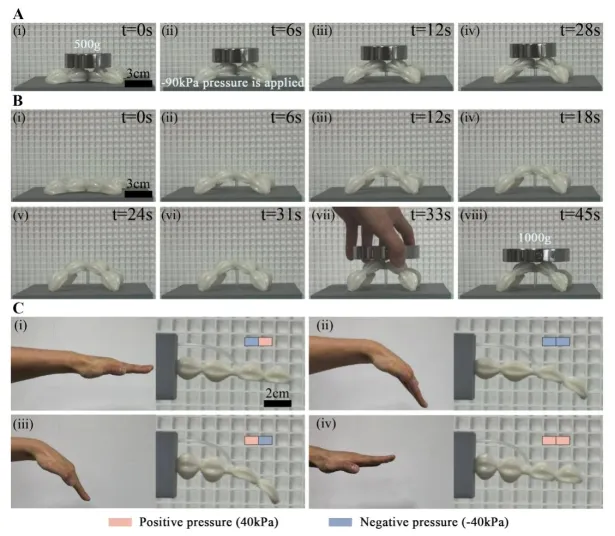 图4. 基于HLA和HBA的结构作为承重桥以及仿生运动的实现。(A) 对基于HBA的承重桥结构(材料:KS-200)施加-90kPa的负压以提升500克的重量(自身重量的14.6倍)。(B) 对基于HBA的承重桥结构(材料:KS-200)施加-90kPa的负压以承受1000克的重量(为其自身重量的29.2倍)。(C) 结合HBA和HLA单元以模拟手腕和手臂的运动,(i) 手臂向前伸展,(ii) 手腕屈曲,(iii) 手臂向后伸展,(iv) 手腕伸直。