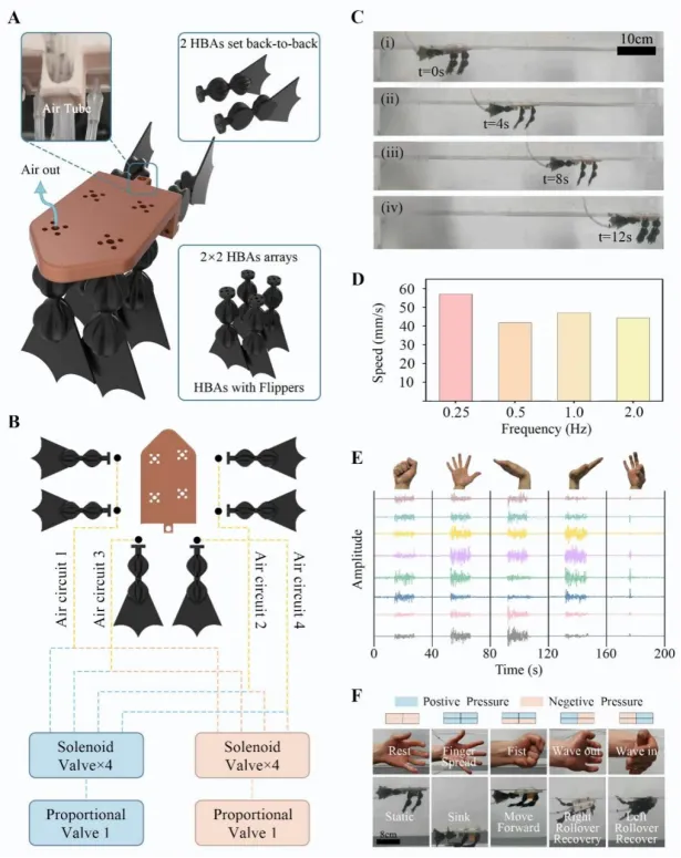 图5. 游泳机器人的设计、控制及性能表征。(A) 游泳机器人的设计,包括一个FDM打印机打印的主体和6个带鳍的HBA。(B) 控制系统与机器人的气动连接。(C) 游泳机器人在0.25Hz驱动频率下的运动展示。(D) 机器人在不同驱动频率下的速度。(E) 进行各种手势时,被myo臂环记录的sEMG信号。(F) HBA状态、游泳机器人运动与手势动作的对应关系。