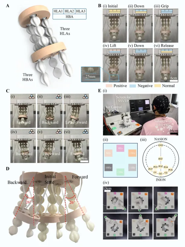 第二,团队开发了一款软体夹持器(图6),内部集成了3个模块化设计的HLA致动器以及3个HBA致动器。通过控制上方的HLA致动器,该夹持器可以向六个方向自由转动,并可以在-90kPa压强的致动下,实现2100g(56.9倍自重)物体的夹取。此外,夹持器还被集成到机械臂末端并与脑电帽相结合,实现了基于ssvep范式的机械臂脑电控制。