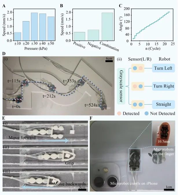 图8. 不同材料制造的软体爬行机器人展示。(A) 不同驱动压强下软爬行机器人的速度。(B) 机器人在正压、负压及其组合驱动条件下的速度比较。(C) 机器人在不同转动周期下的转角。(D) 由80A树脂制成的爬行机器人循迹功能展示。(E) 爬行机器人从方形管中取出物体展示。(F) 微型软爬行机器人在iPhone手机上的运动展示。