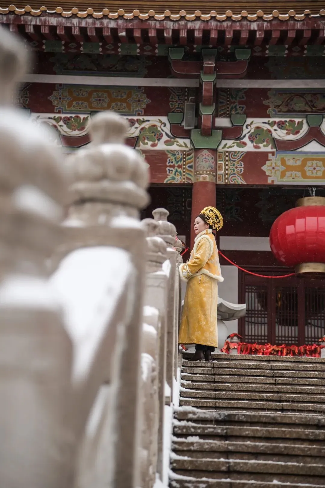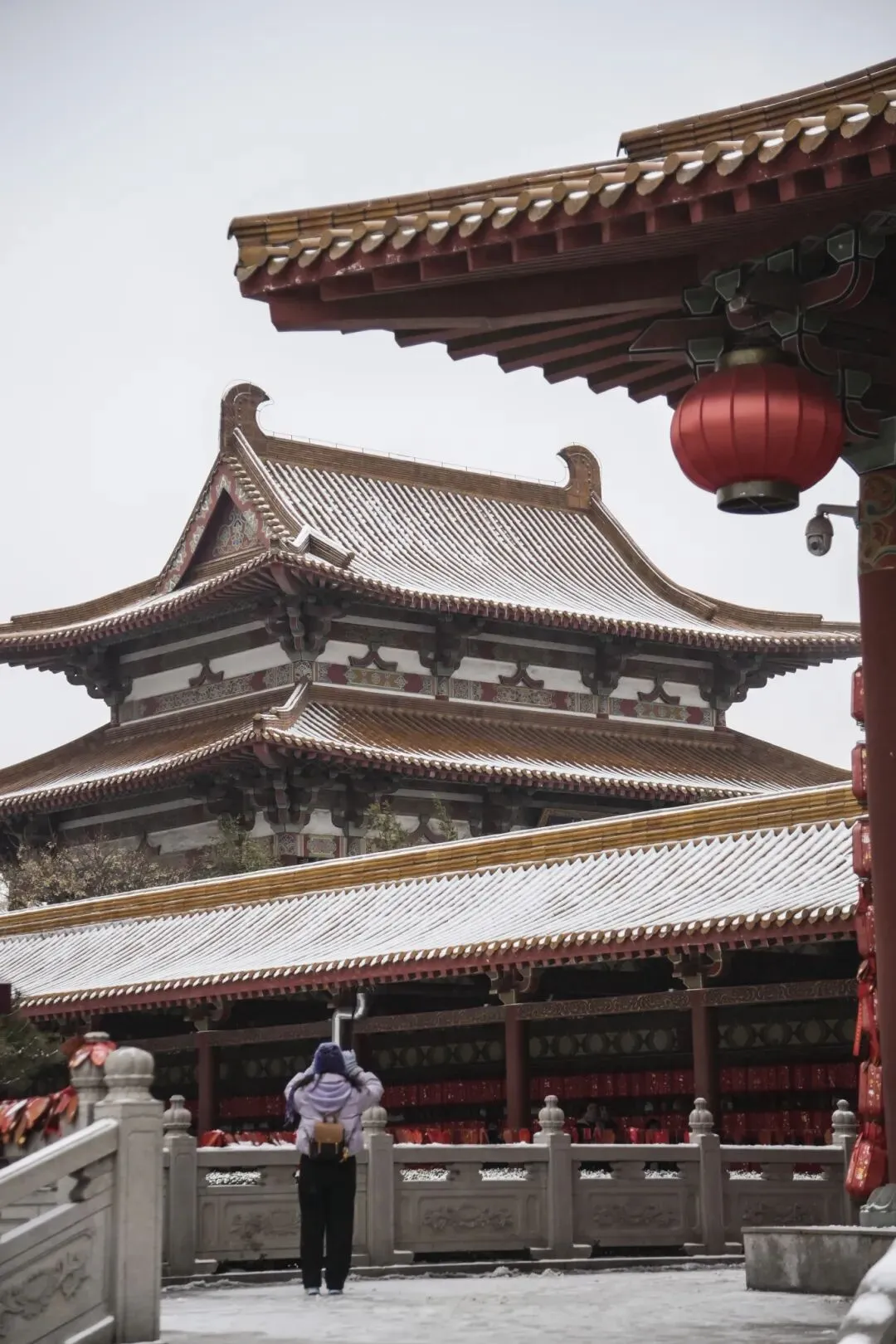 飞檐翘角上积着薄薄一层雪,少了平日里的热闹,多了份安安静静的韵味。风一吹,雪花轻轻飘,连空气都透着股清清爽爽的静谧感。