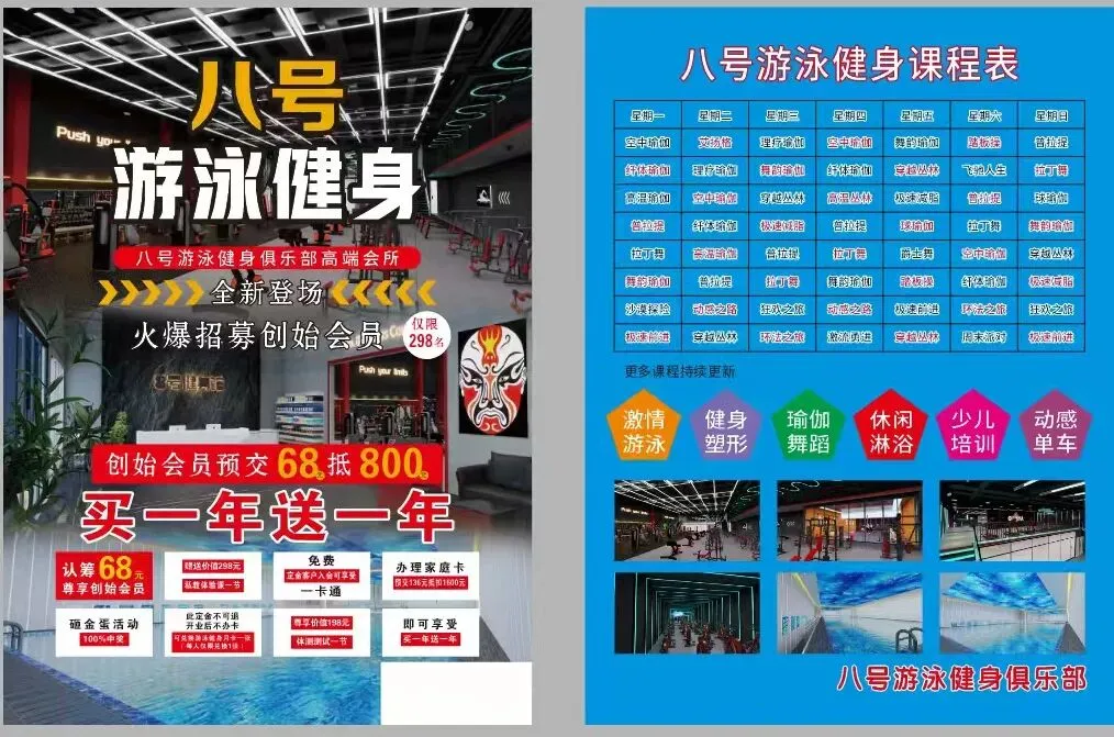 《八号游泳健身》重装升级,独栋两层超大运动空间,8000平游泳健身会所。室内恒温泳池、百台专业进口器械、动感单车、瑜伽普拉提以及各种舞蹈操课。仅限前298名创始会员享受福利如下⬇️✅预存68元,开业办卡抵扣800元。家庭卡预存136元抵扣1600元✅转发朋友圈集赞18个,买一年送一年,再送游泳两件套✅开业后对价格或环境不满意🉑兑换一个月通用卡报名方式:定金➕姓名电话联系人常店长:17721311491