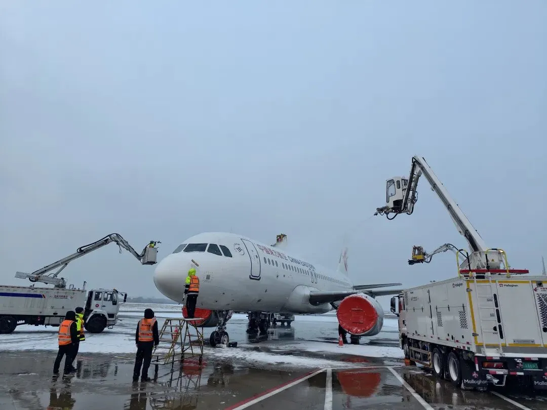 为确保航班的安全运行,东航江苏公司组织除冰车为每一架起飞的航班开展除冰雪作业,在航空器下方采用人工除雪的方式除雪,与航空器有安全距离的区域采用除雪车除雪。目前第一个航班MU2721已经安全起飞。吉祥航空江苏分公司迅速启动冰雪天气保障预案,组织工作人员连夜开展飞机除冰除雪作业。