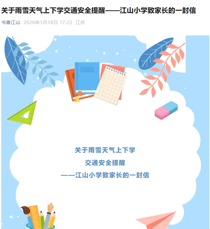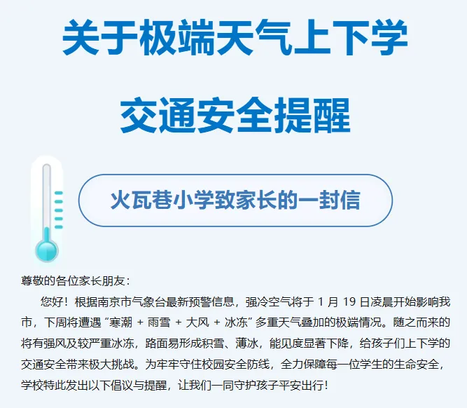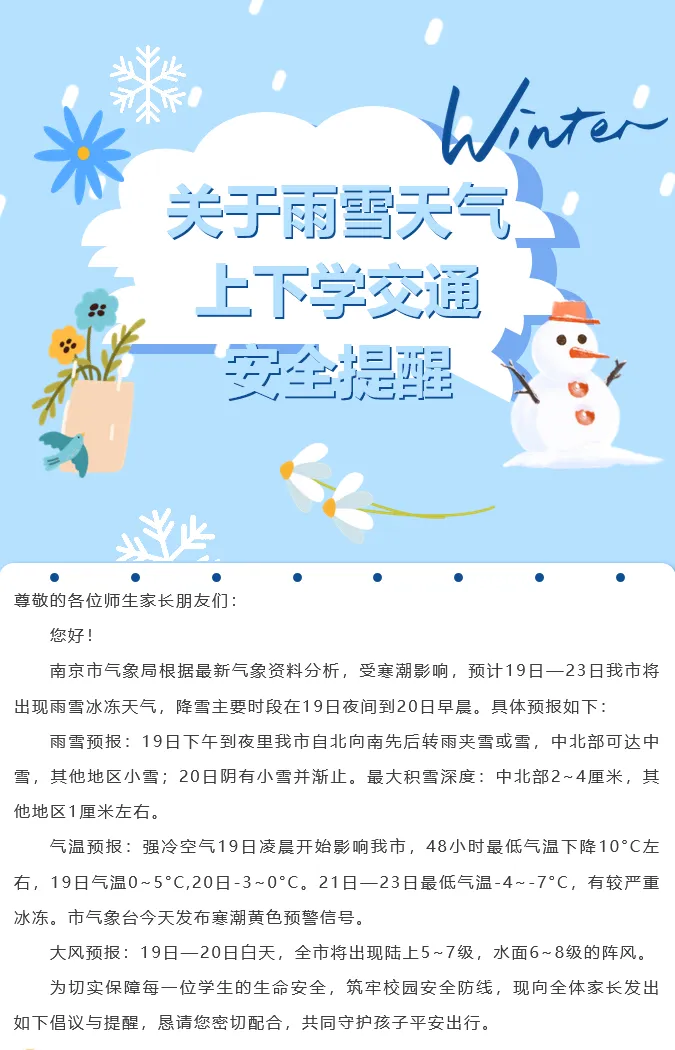 面对明显的降雪、冰冻和大风天气,南京多所学校也第一时间向学生和家长发布了极端天气上下学交通安全提醒。
