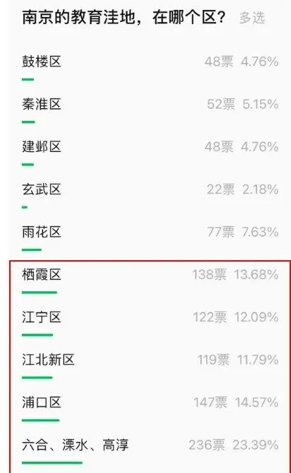 接下来的栖霞区、江宁区、江北新区、浦口区、六合区、溧水区、高淳区就是家长们你一票我一票投出来的“教育洼地”,每一个都票数过百!