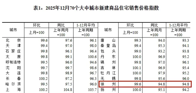就在1月19日,2025年12月份70个城市房价指数对外公布,徐州新房价格环比下跌0.4%,环比5连跌,但跌幅收窄一半!