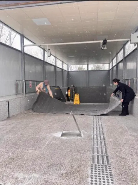 运营期间,各车站严格落实“闻雪即动、持续清防”:出入口、楼梯、通道等重点区域,工作人员循环清扫积雪,铺设防滑垫、设置警示标识,广播实时提醒“小心地滑”,做到“雪落人到、雪停路净”。