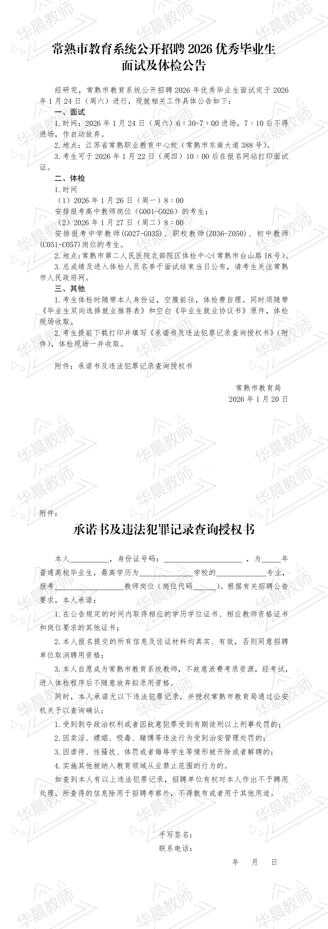 常熟市教育系统公开招聘2026年优秀毕业生面试及体检公告