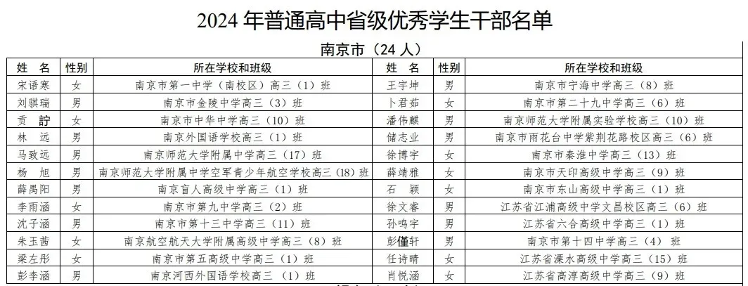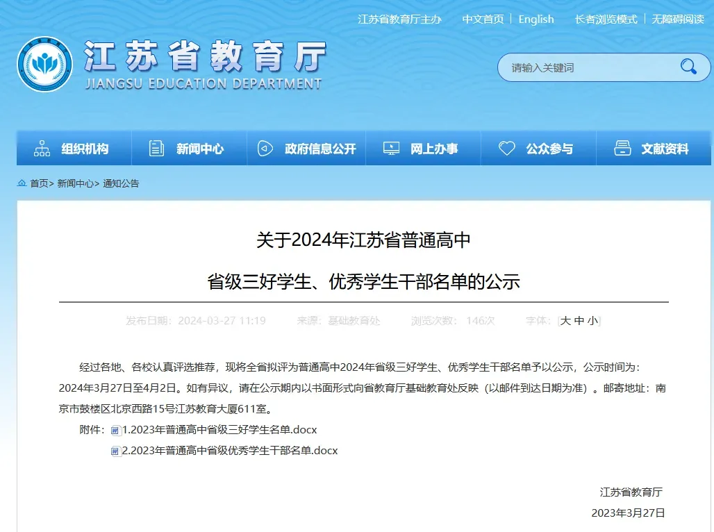 经过各地、各校认真评选推荐,现将全省拟评为普通高中2024年省级三好学生、优秀学生干部名单予以公示,公示时间为:2024年3月27日至4月2日。如有异议,请在公示期内以书面形式向省教育厅基础教育处反映(以邮件到达日期为准)。邮寄地址:南京市鼓楼区北京西路15号江苏教育大厦611室。