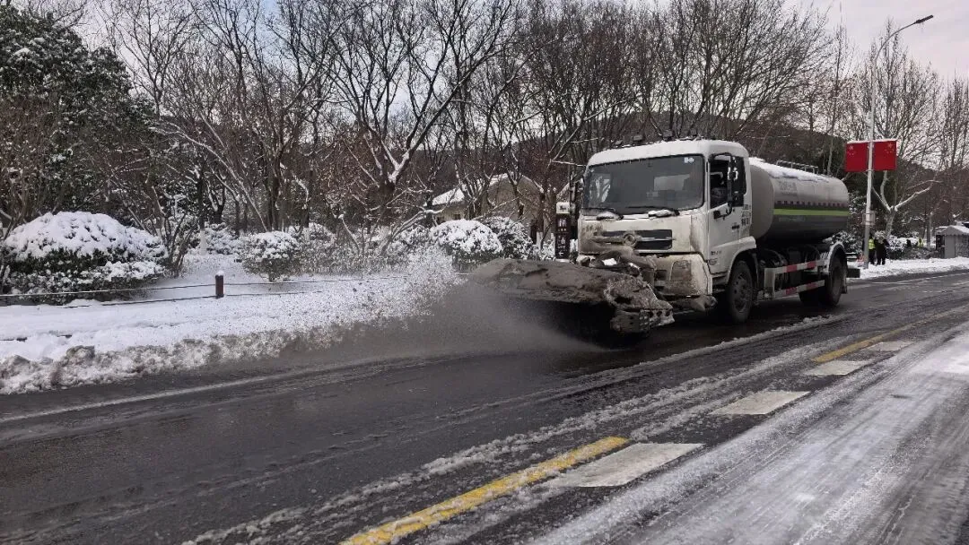 新沂市采取“机械抛洒为主、人工补撒为辅”模式,300余名工作人员顶风冒雪,动态调整作业强度,全力保障道路通行;睢宁县针对桥梁坡道、公交站点等关键区域,运用“机械冲洗+人工推扫”组合方式,精准调控融雪剂用量,兼顾除冰效率与生态环保;云龙湖行政执法大队聚焦景区安全保障重点,对坡道、景观道、山林步道等点位综合运用“撒、推、铲、扫”作业技法,切实守护游客出行安全与景区秩序稳定。
