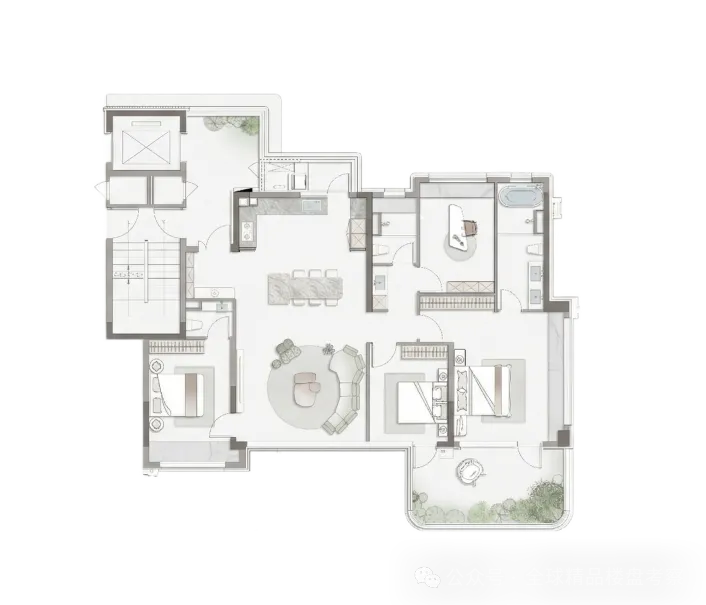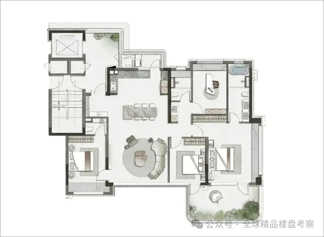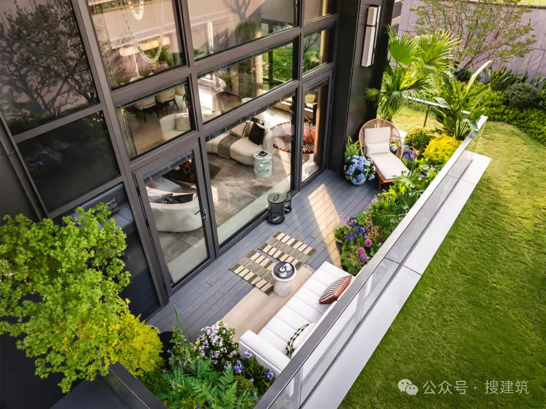 作为四代宅核心亮点,约6.2米挑高露台与退台、弧形元素结合的阳台设计,打破传统建筑刻板印象,层层错落的空中花园空间,实现 “建筑形态 - 居住功能 - 景观体验” 的三重统一。