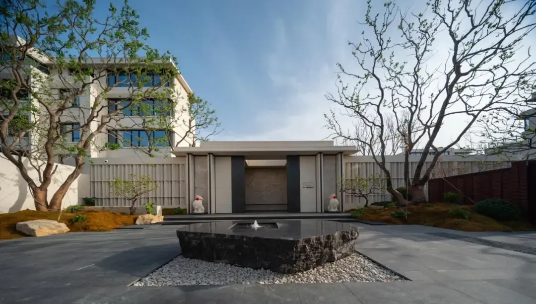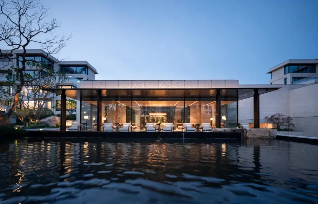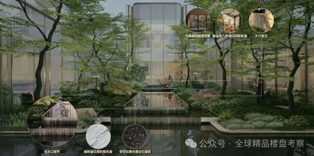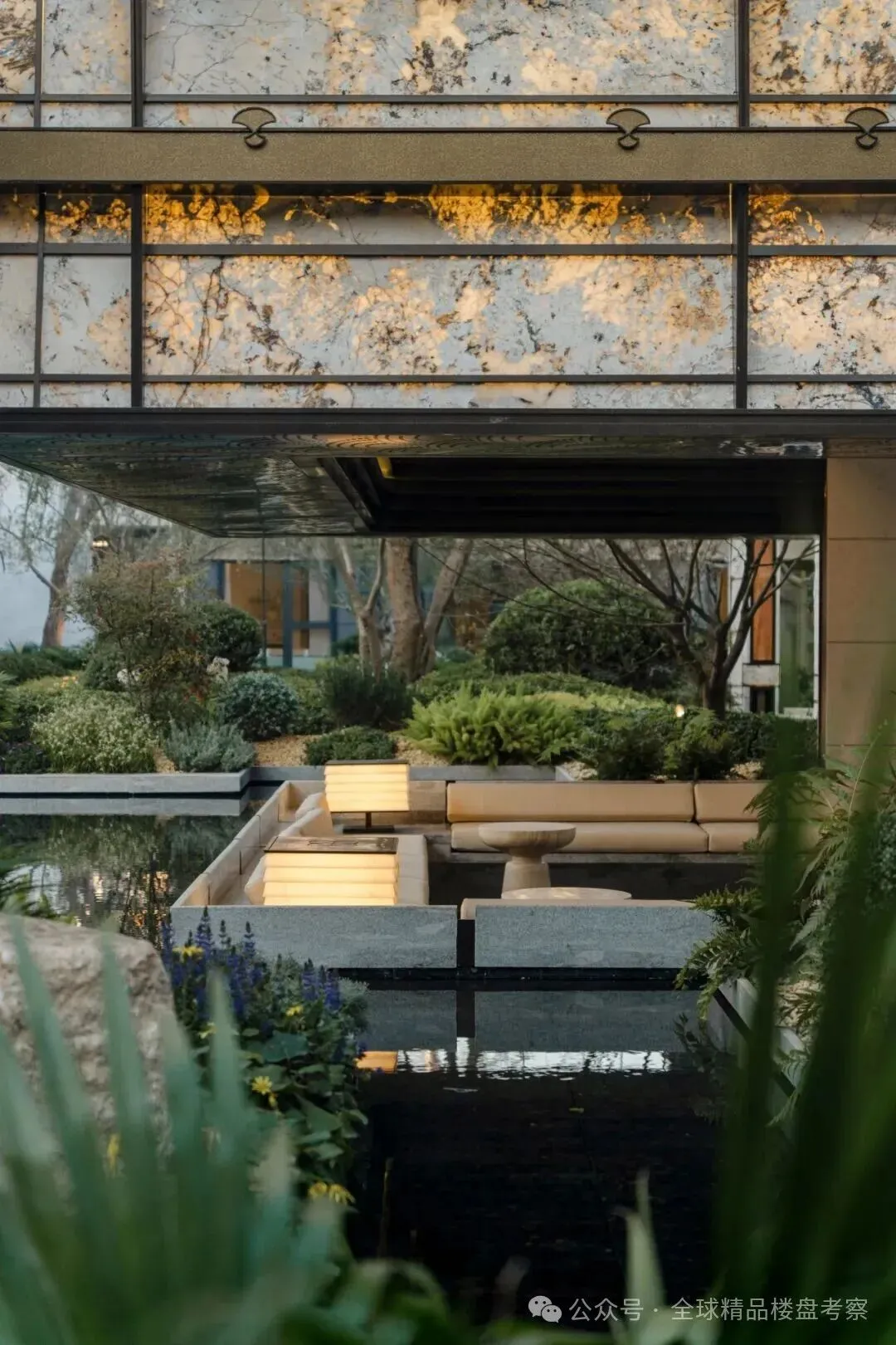 大量使用玻璃、金属和石材等现代材料。庭院内部建筑与水景的结合是一大细节亮点。