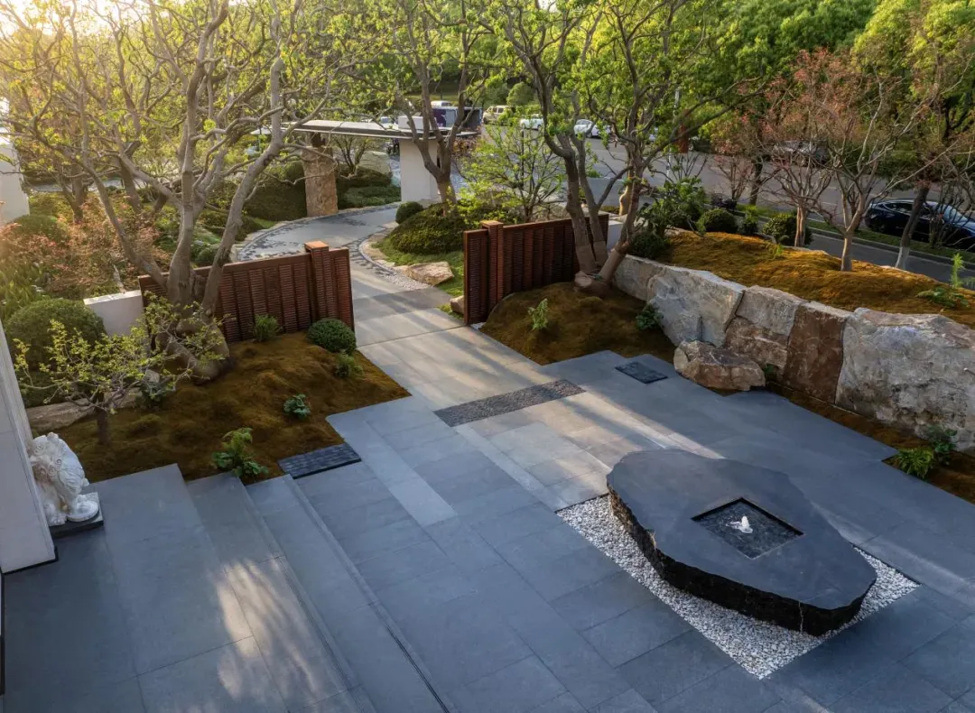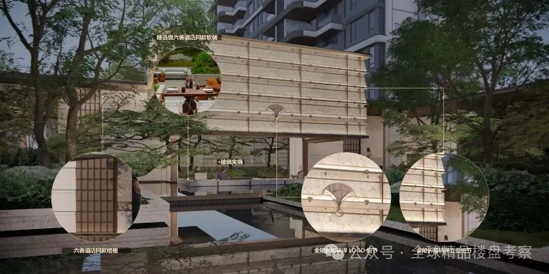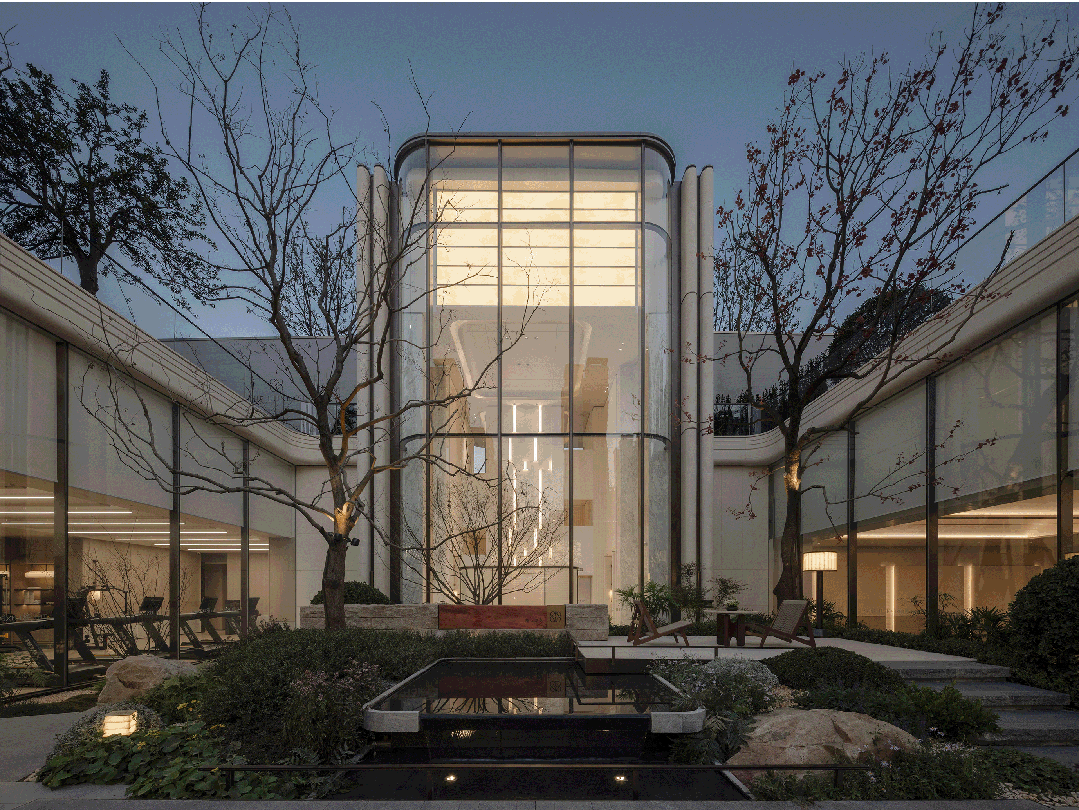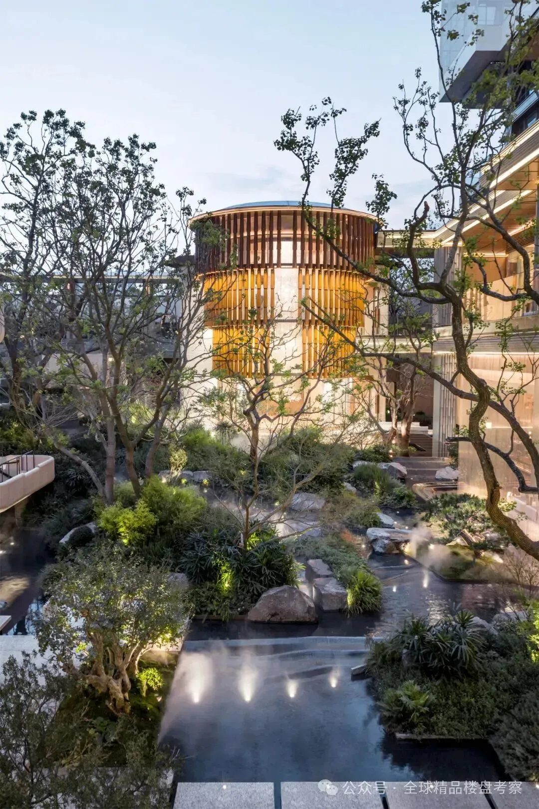 大量使用玻璃、金属和石材等现代材料。庭院内部建筑与水景的结合是一大细节亮点。
