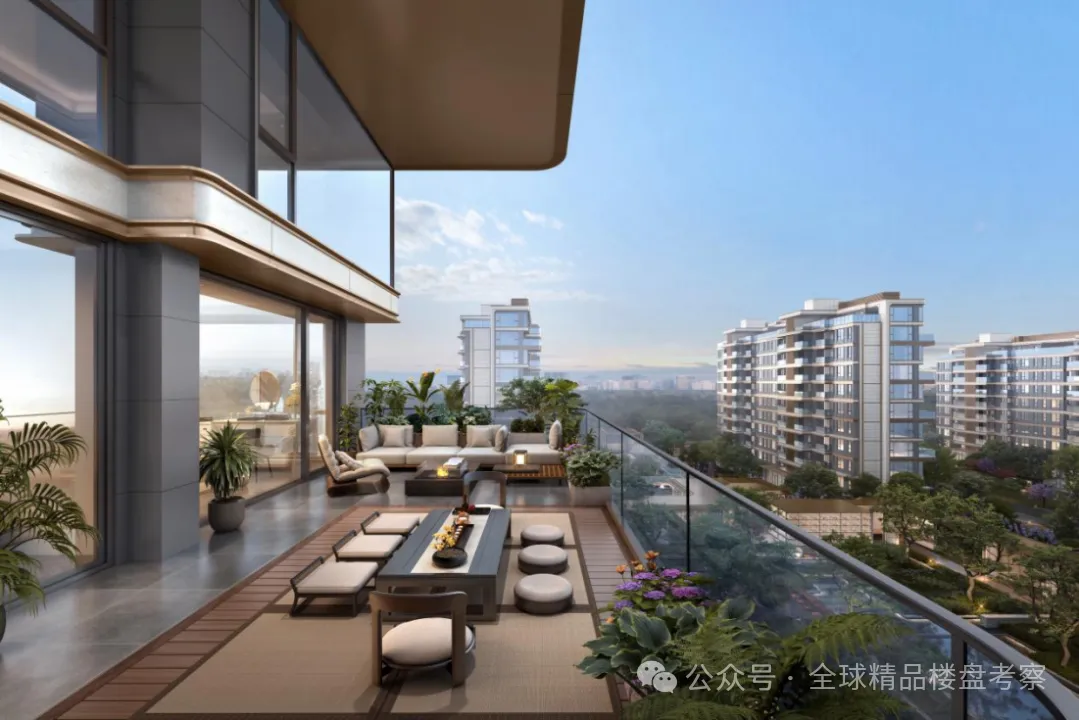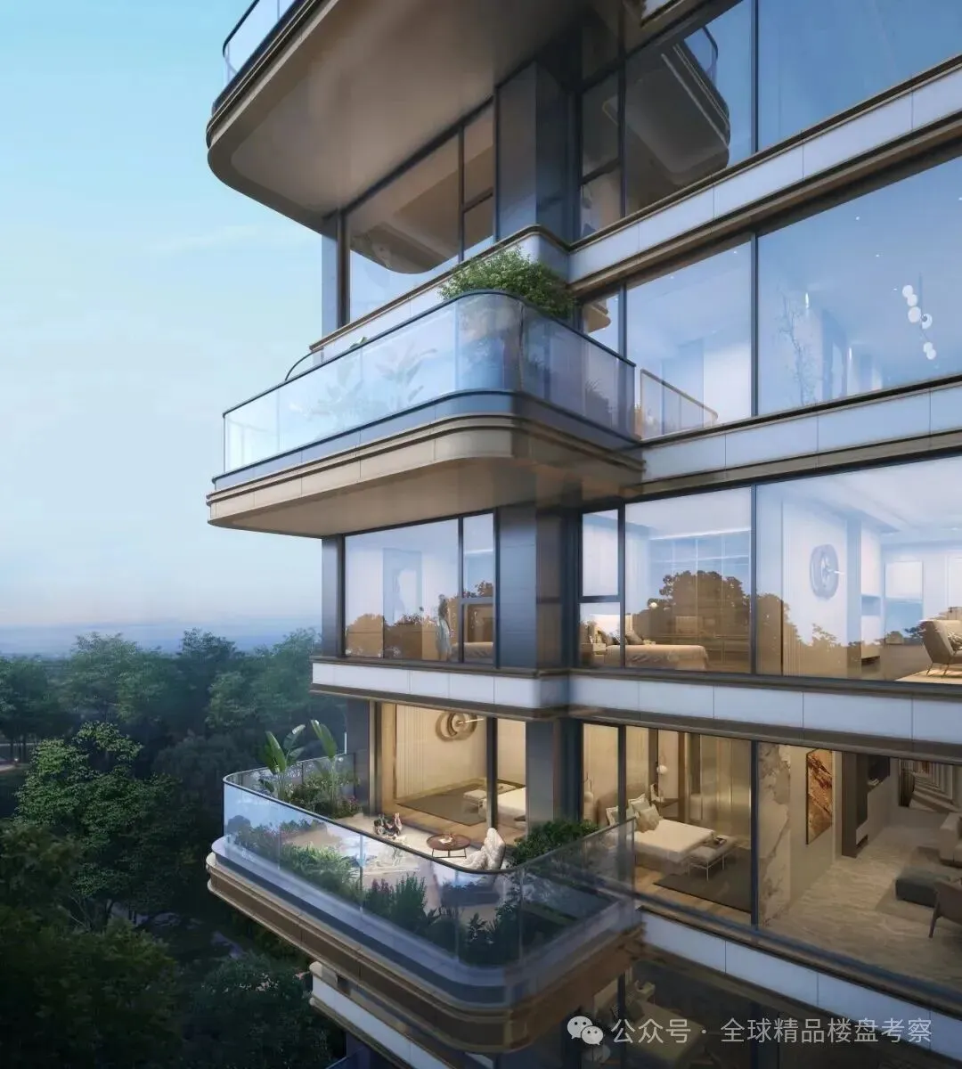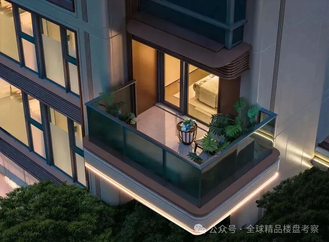 阳台采用错层设计,形成动态的视觉节奏,同时避免了立面的单调重复,符合当下高端住宅的审美趋势。