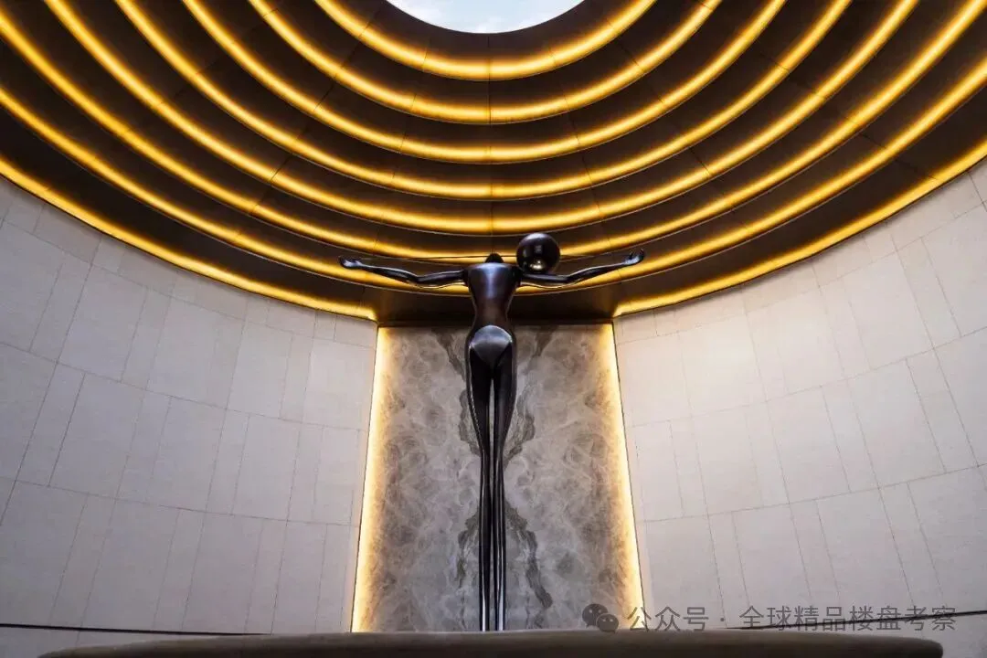 从仪式感强烈的门庭,到灵感源于古罗马万神庙的圆形精神空间;从深圳爱马仕之家同款的绿釉陶筒,到墙面上铺陈的北京国家大剧院同款贝金米黄石材……