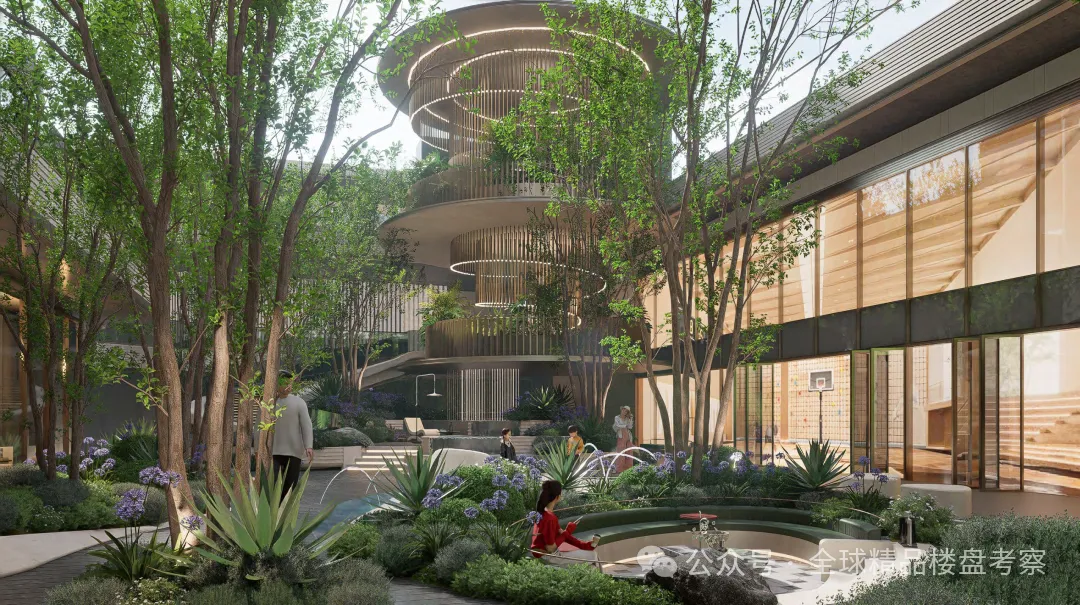 低容积率的优势,孕育出超大 景观中轴。 “下沉式 + 立体式” 复合中央庭院,以高差营造多重景观层次,构建社区生态核心。“建筑为景观让渡,景观为生活服务” 的规划逻辑。