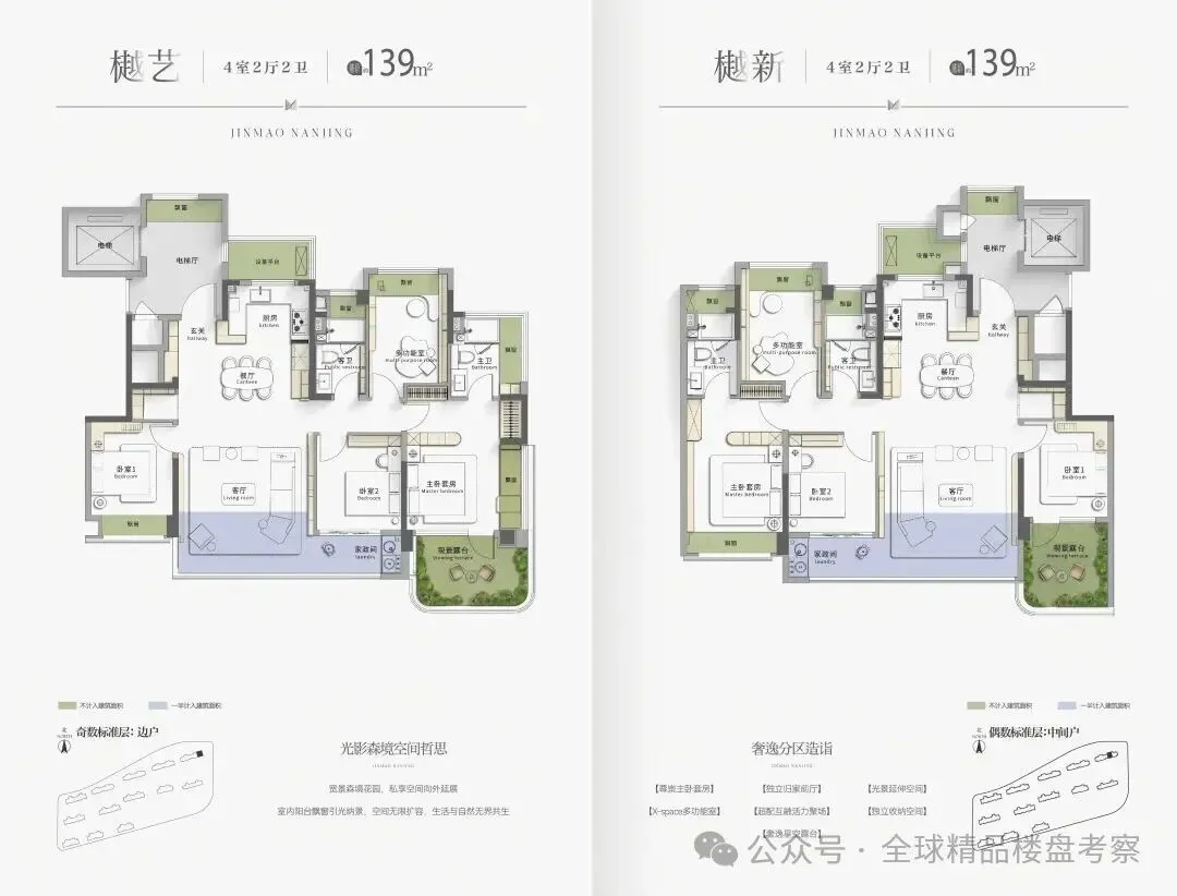 建面约139㎡四房两厅两卫,尺度较122平更开阔,四开间朝南,奇数层边户观景露台连通主卧套房,东侧带两个飘窗,采光视野绝了,其他依然是全屋多飘窗+北设备平台,空间利用率高。