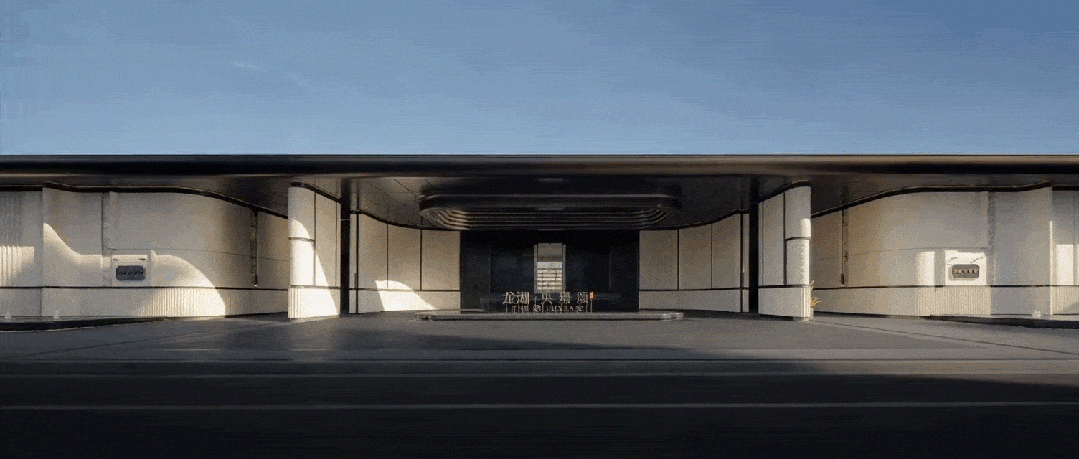 单元门头并非依附于建筑立面的 “开口”,而是独立的 “建筑小品式模块”。采用「顶部弧形飘板 + 两侧立柱 + 玻璃幕墙」的围合结构,形成一个独立的 “入户盒体”,强化了入户空间的昭示性;顶部飘板的弧形轮廓弱化了入户空间的硬朗感,通过光影变化增加了立面的层次。