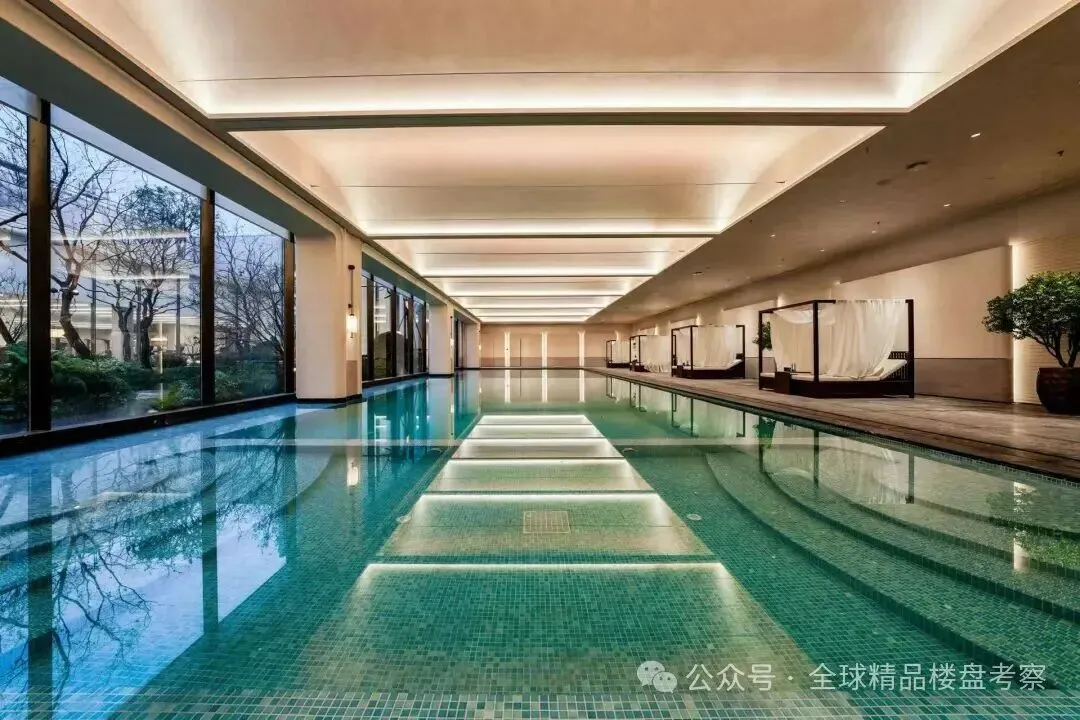 超大面积落地窗衔接室外园林,既借景自然弱化了室内封闭感,又通过纵向延伸的泳池 + 层级吊顶,强化了空间的开阔与仪式感。