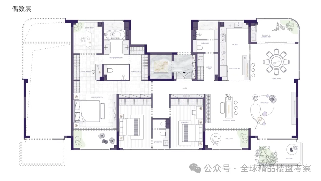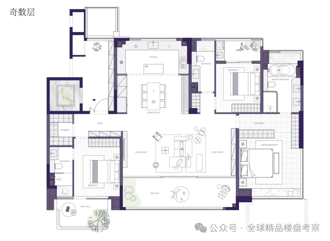 偶数层中间户也是全明电梯厅,全屋多飘窗+北向带设备平台,不同的是南次卧连通观景露台,归家体验感与舒适度双优。