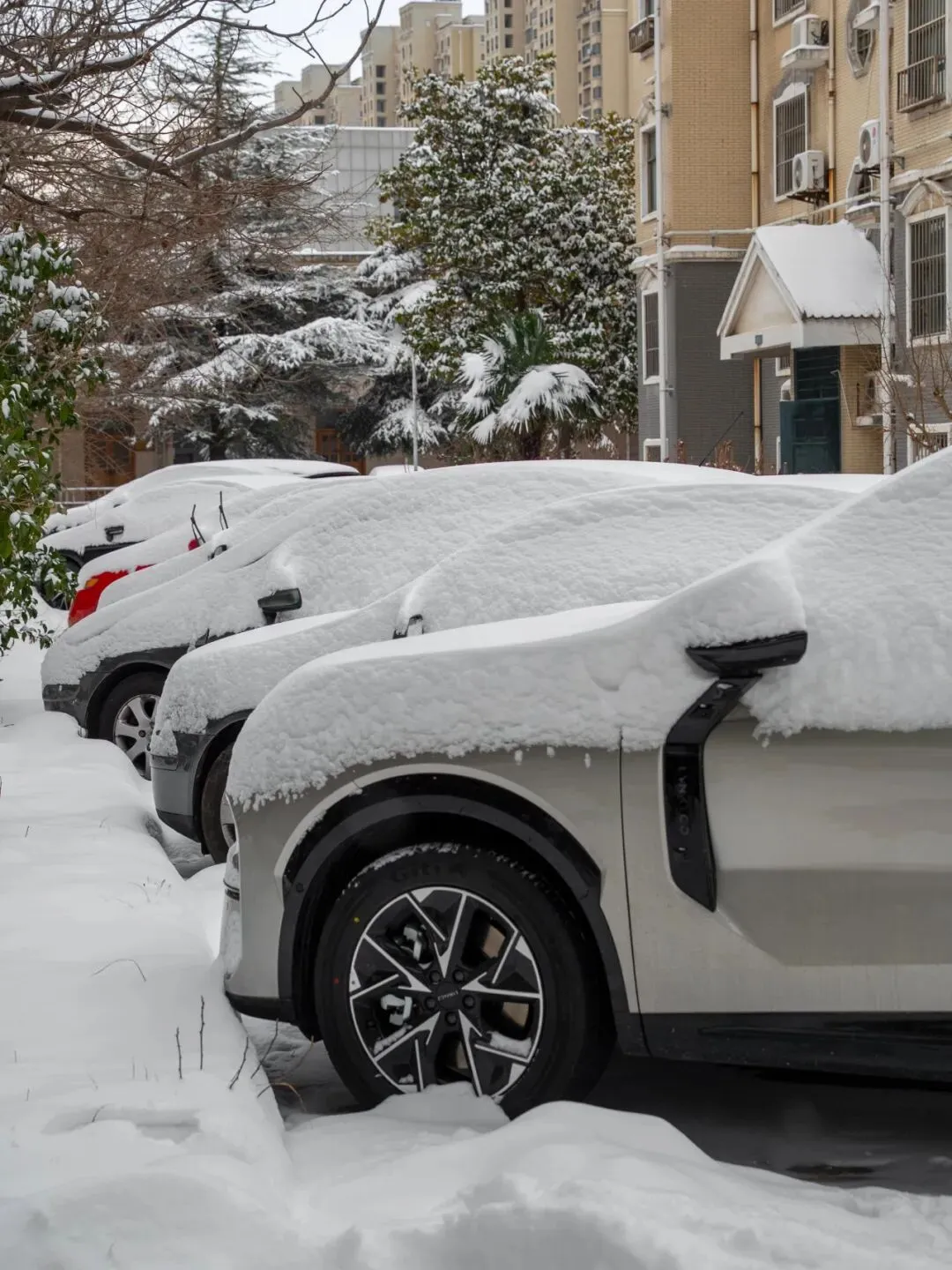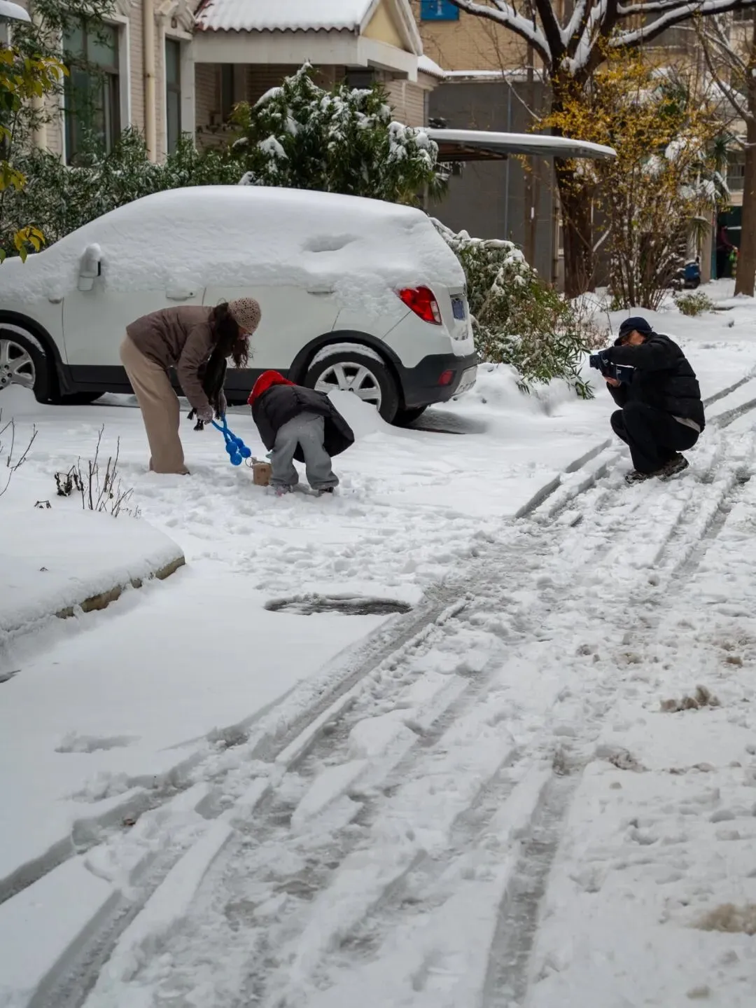 周围的房子像披上了一件件蓬松的白外套,路边的汽车也仿佛套上了臃肿的外衣。