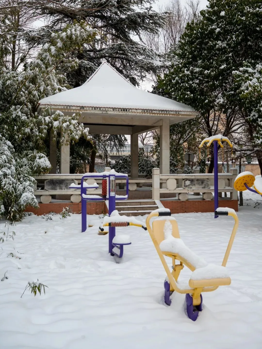 亭子及旁边的运动器械,显得有了灵气。