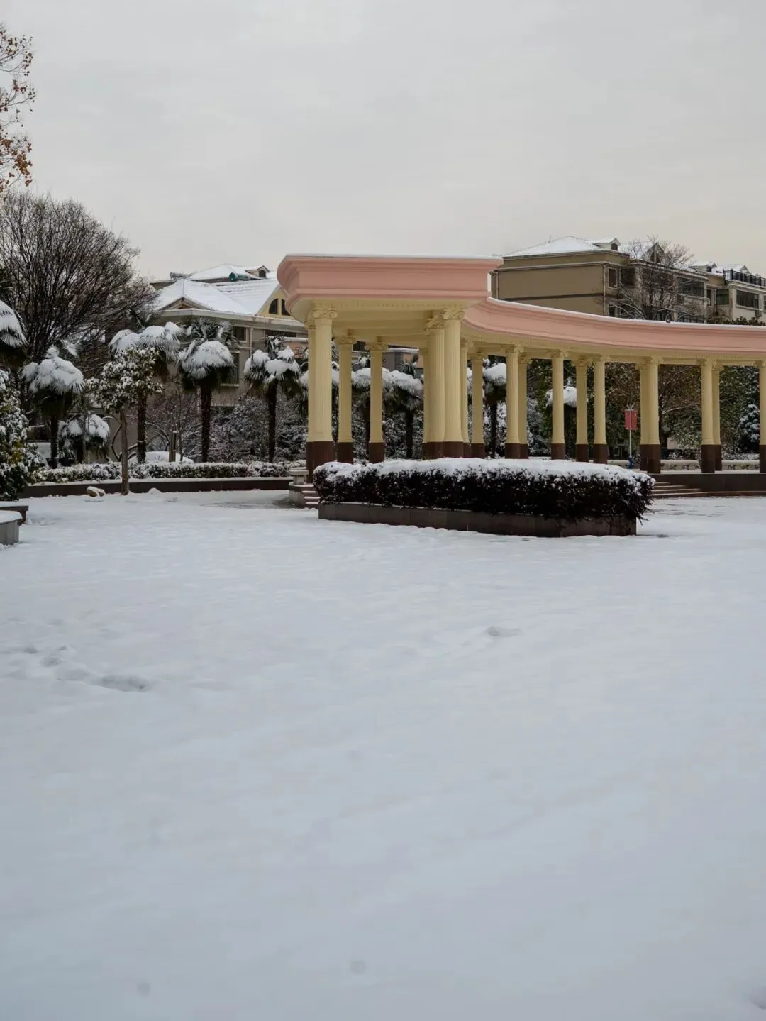 小区广场。本想进入广场拍几幅照片,但积雪下的大理石地面实在太滑,人在上面无法行走,作罢。