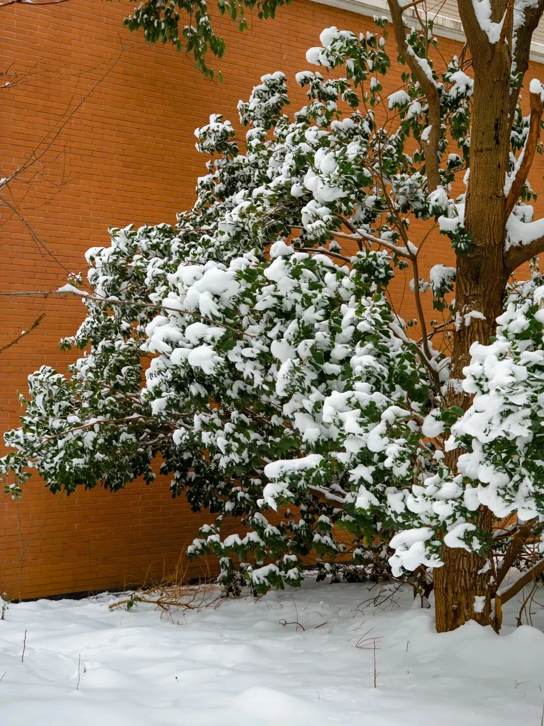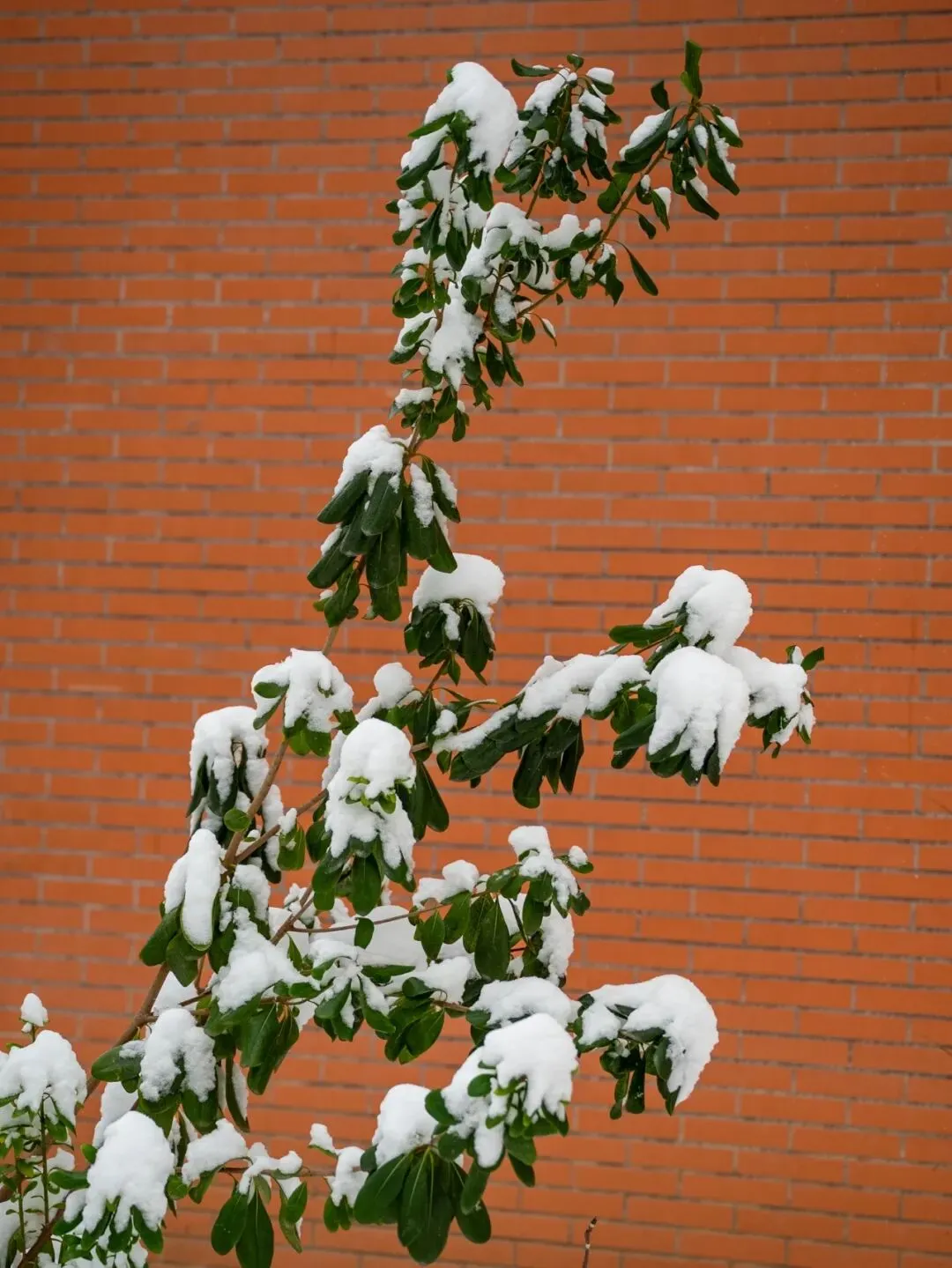 红墙背景映衬下绿叶上的积雪更显美丽。