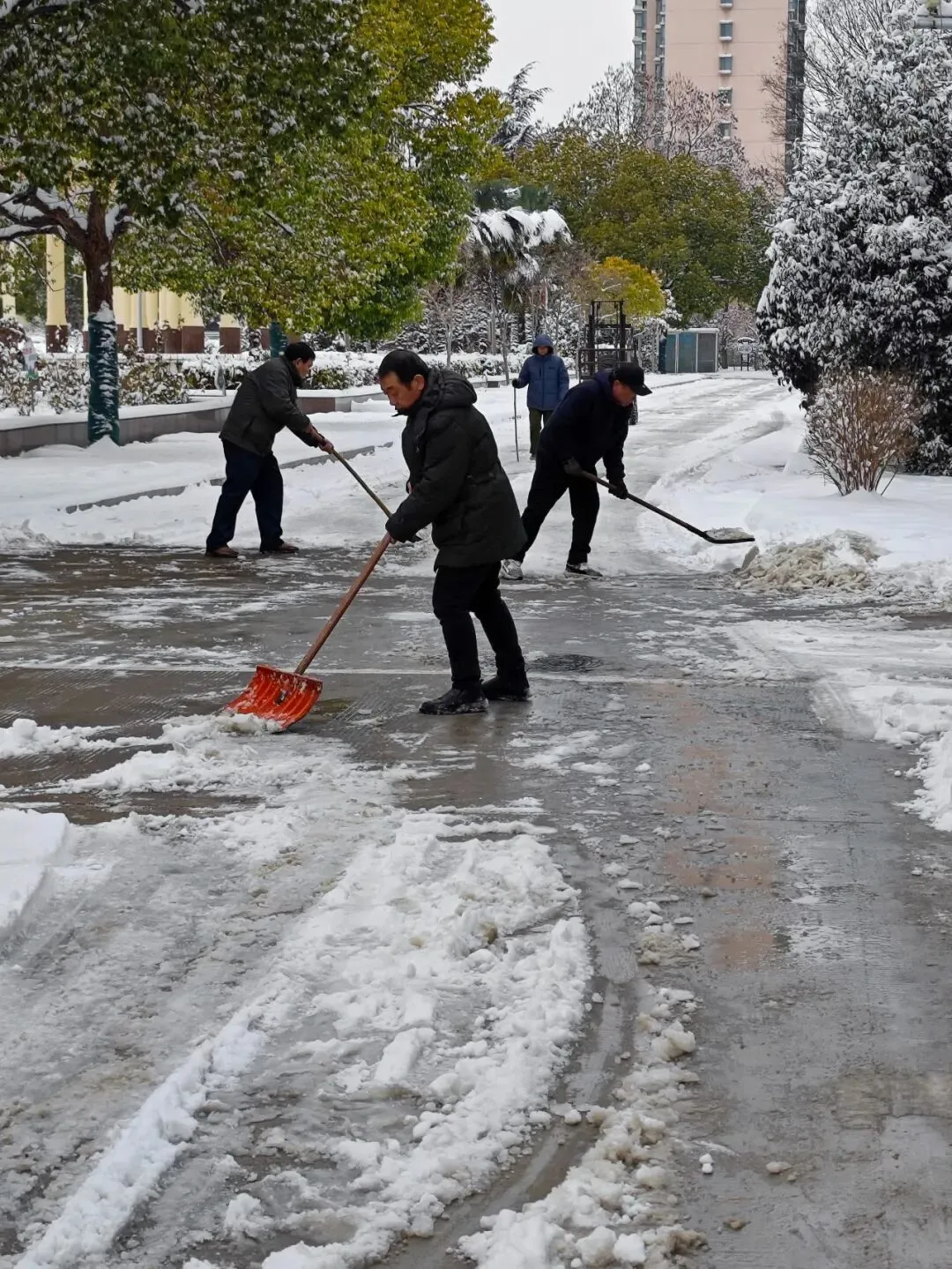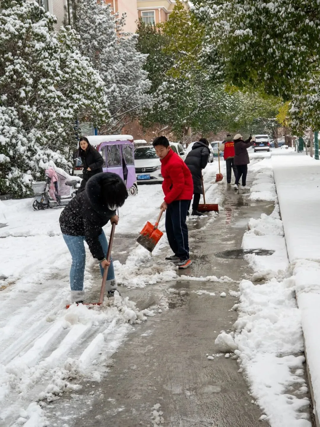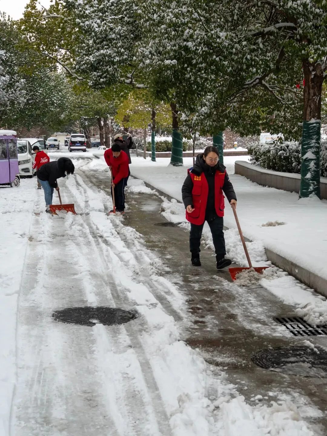 社区刘书记在带领工作人员清扫积雪。