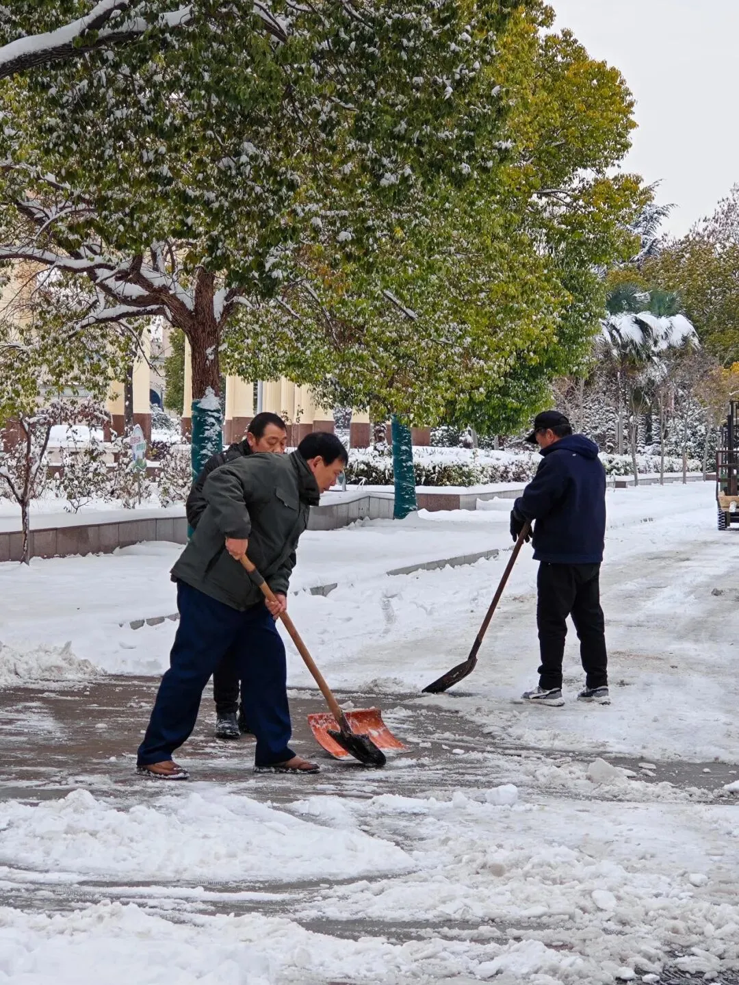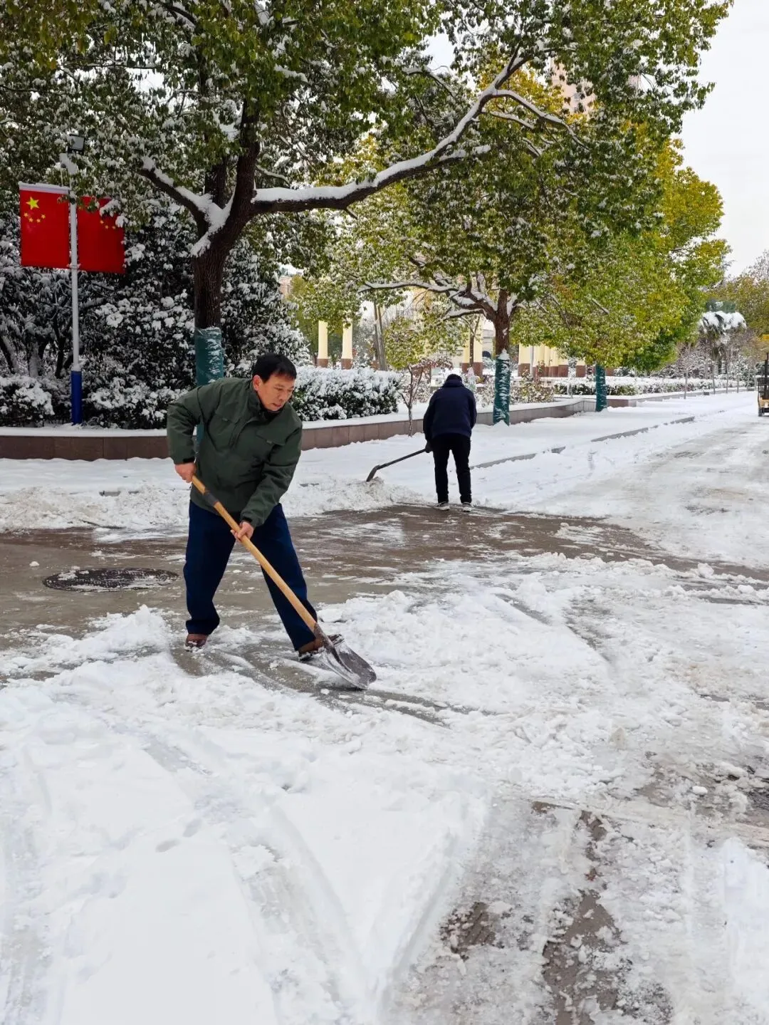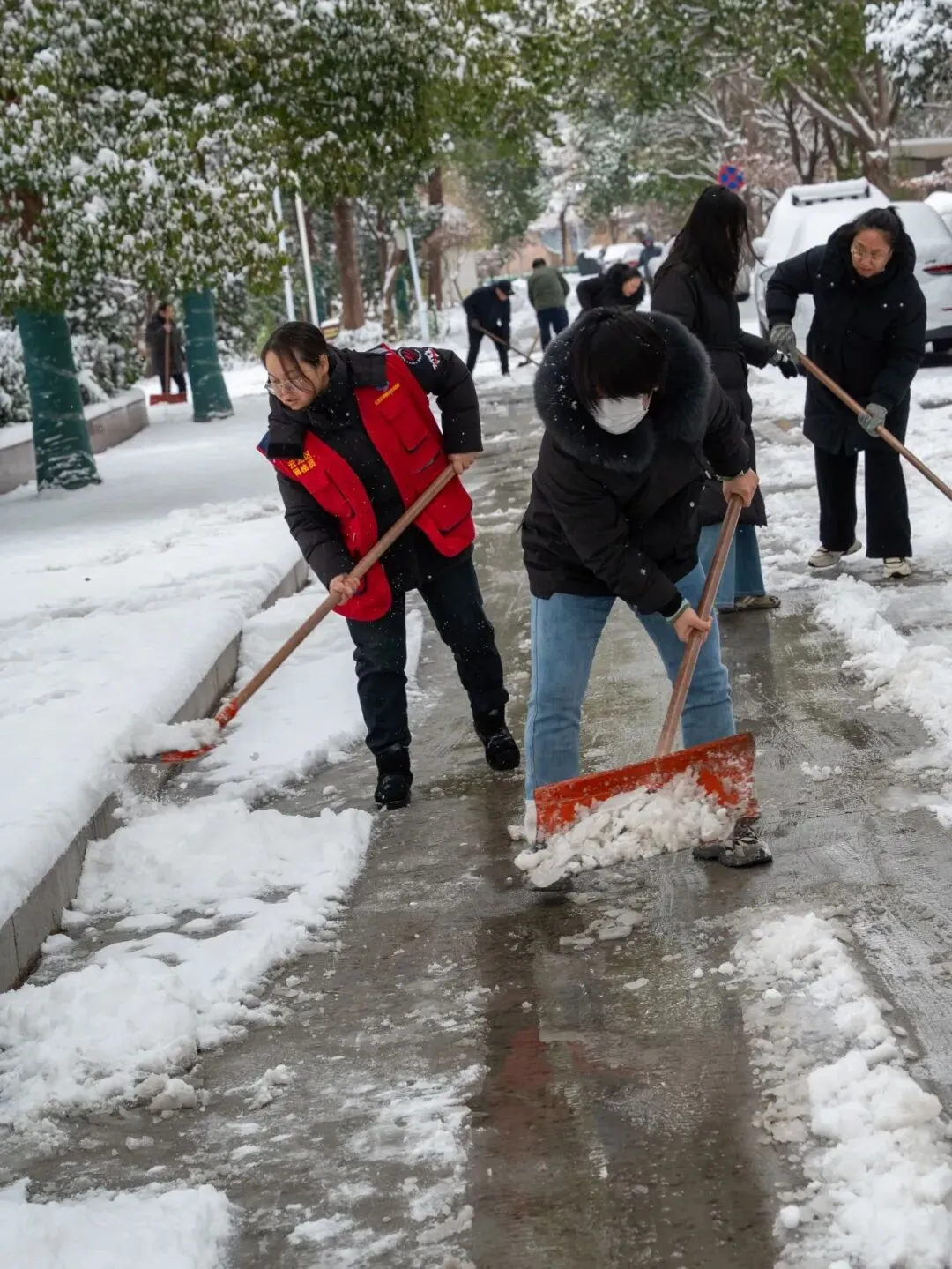 社区刘书记在带领工作人员清扫积雪。