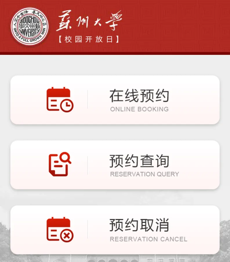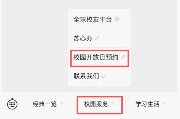 2.关注“苏州大学”微信公众号,点击“校园服务”-“校园开放日预约”进行预约。