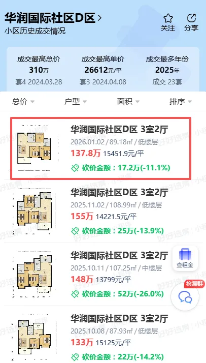 华润国际社区D区,在经历房价剧烈调整后,1月最新成交价格,低楼层反弹到了15451.9元/㎡;