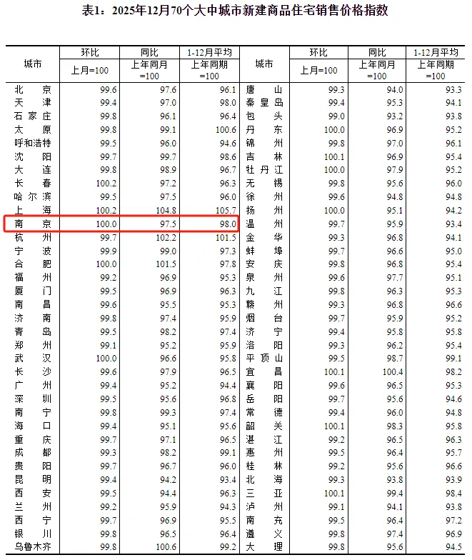 在最新发布的“2025年12月份70个大中城市商品住宅销售价格指数”中,南京新房价格环比不变。而再往前一个月,南京新房价格则环比上涨0.2%。