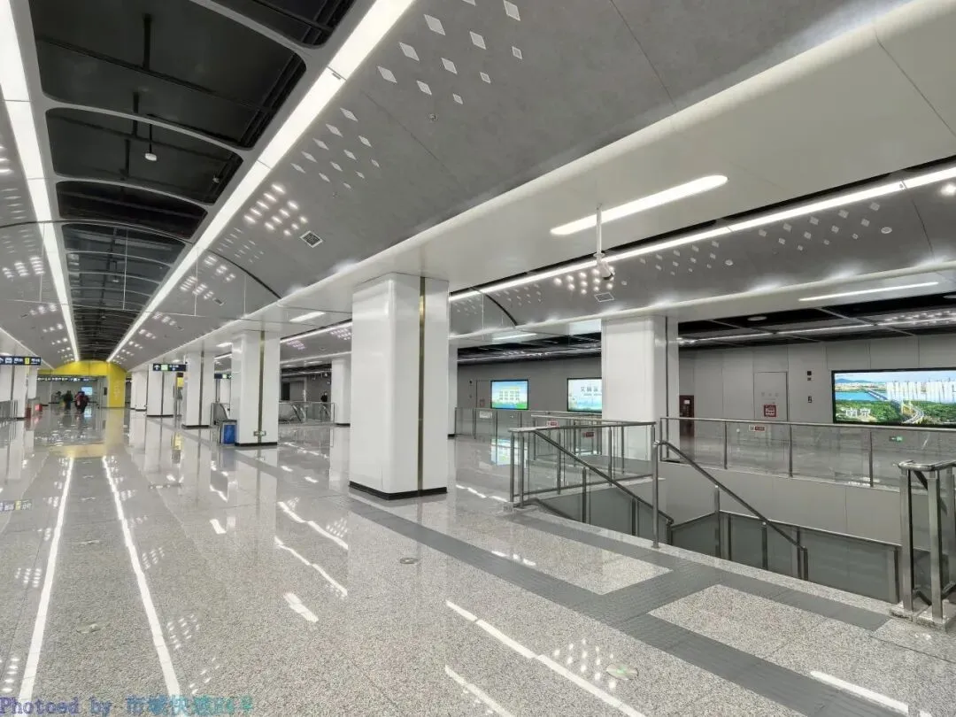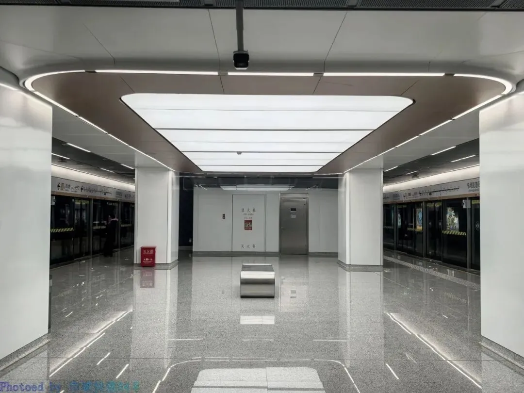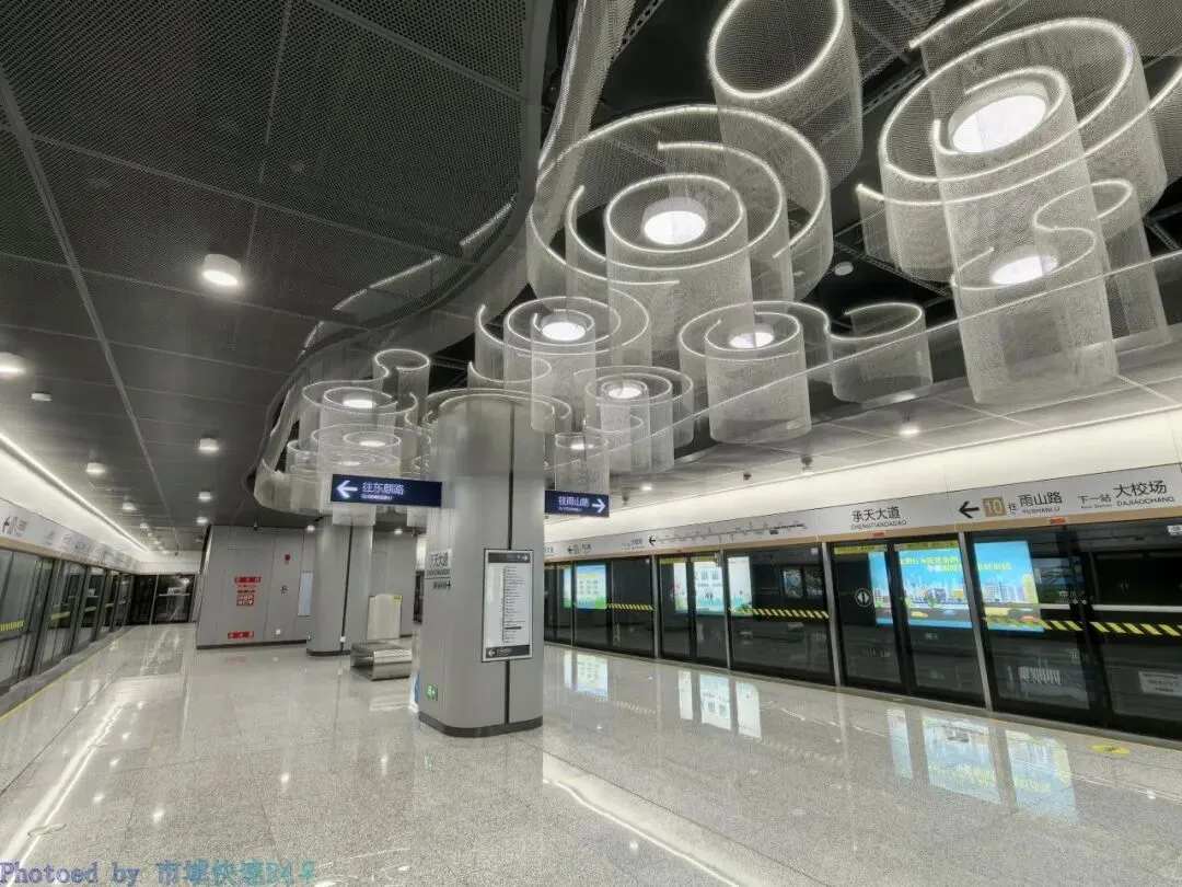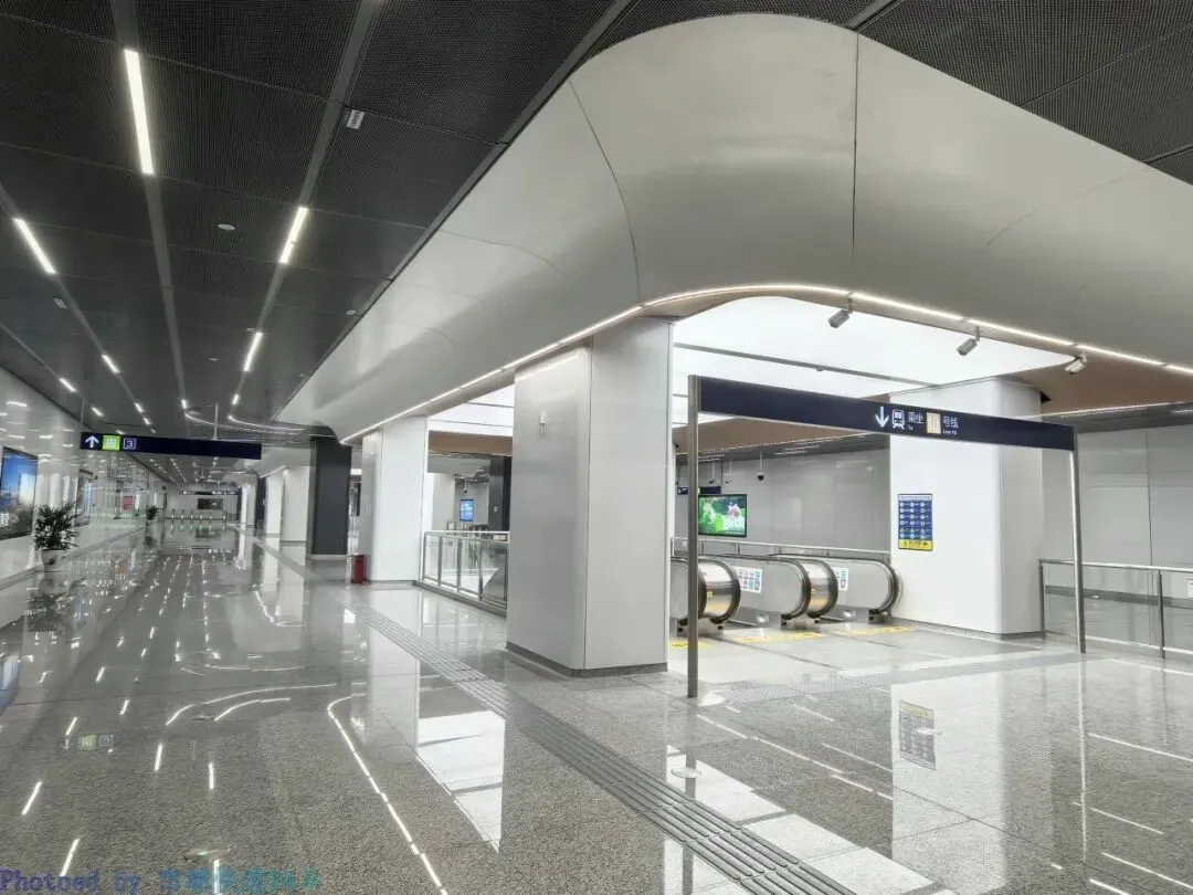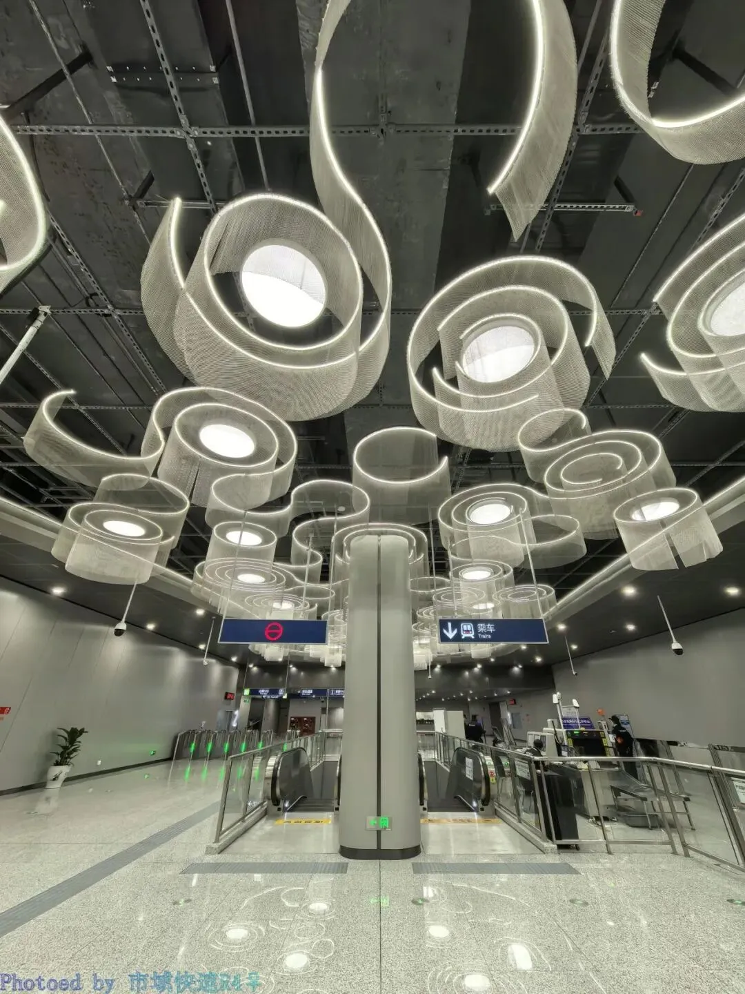 机场跑道旧址站站厅层,将机场跑道轨迹化为天花核心视觉语言,通过动感曲线造型与嵌入式灯光系统交织,塑造出富有流动感与未来感的立体空间,生动诠释城市的能量与速度