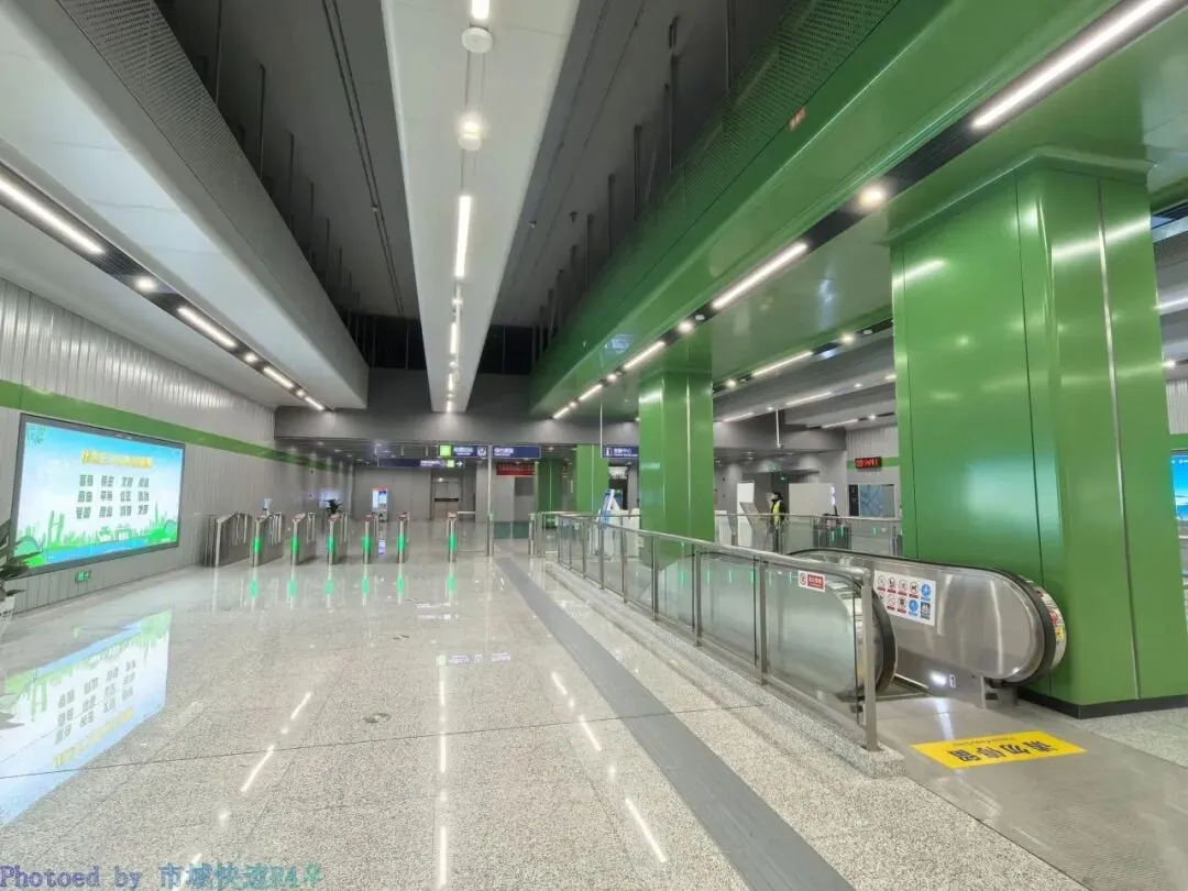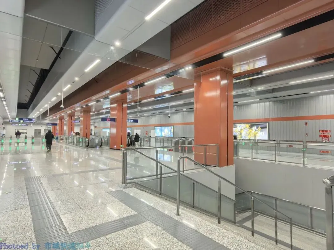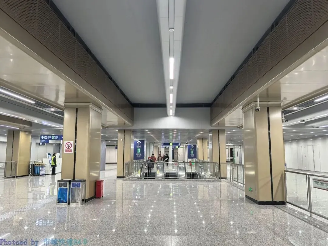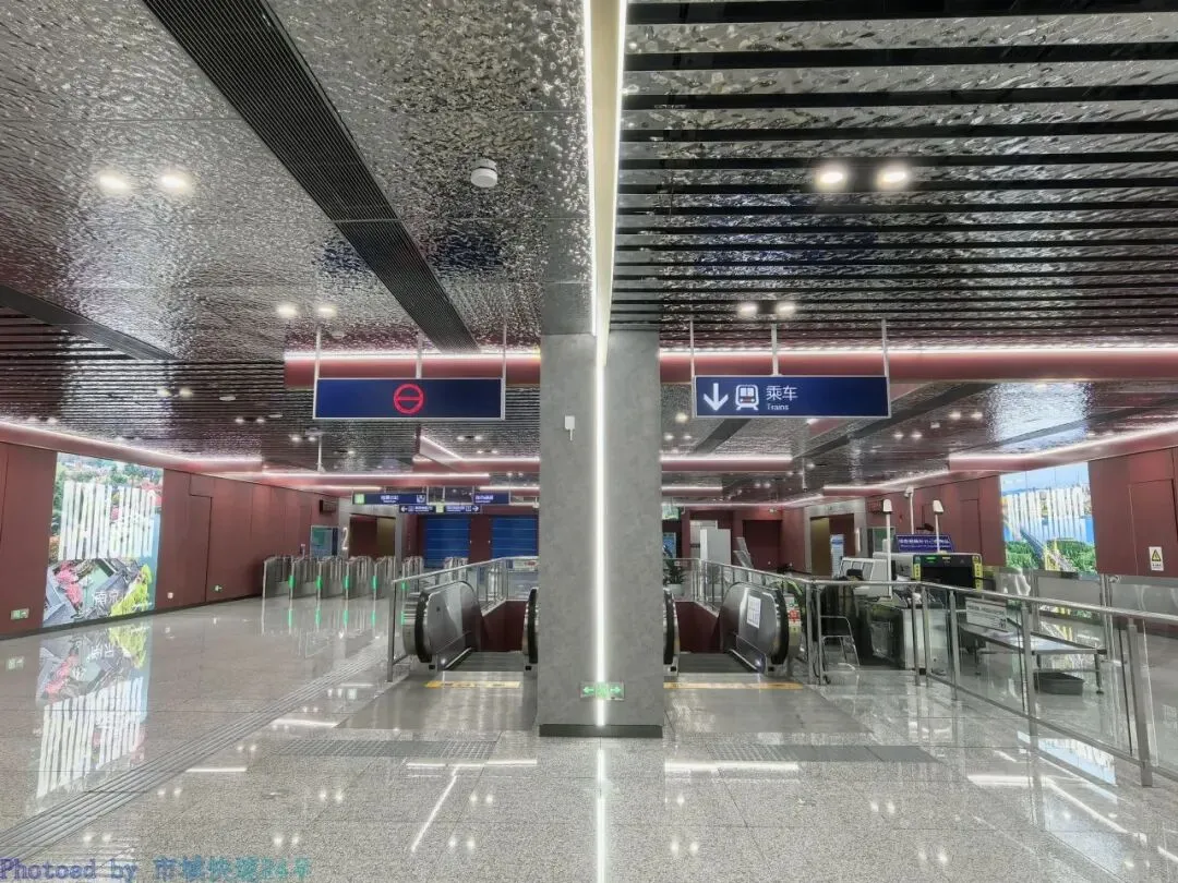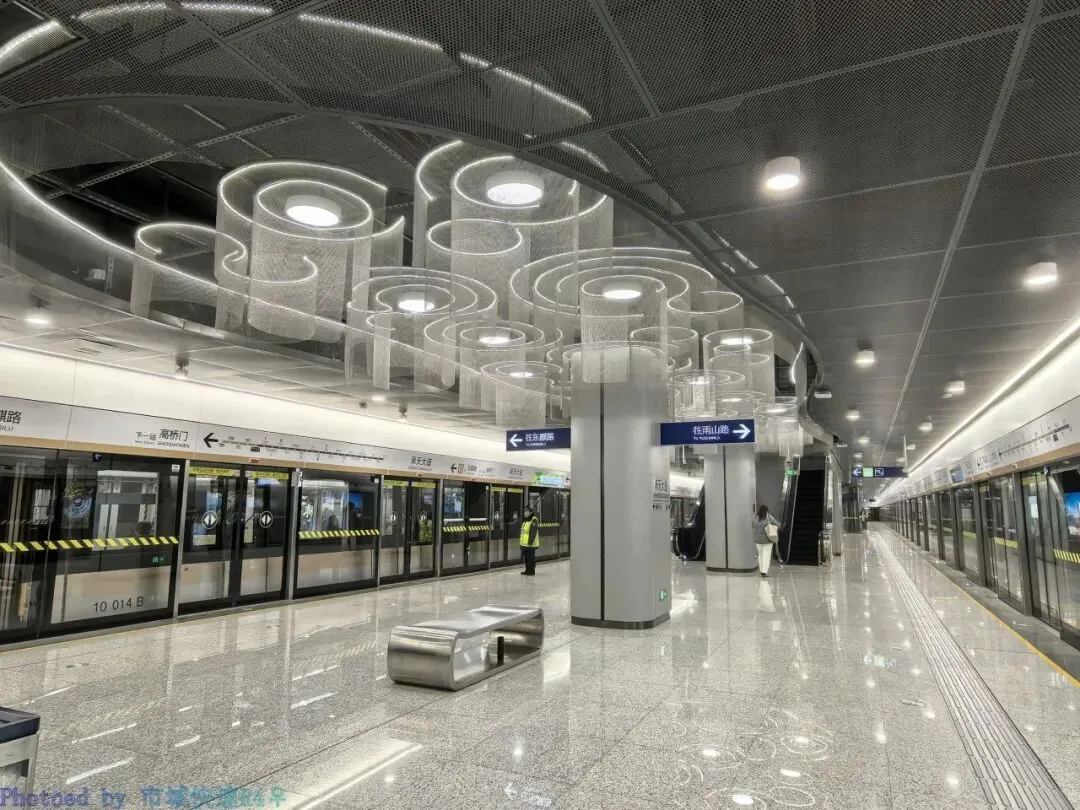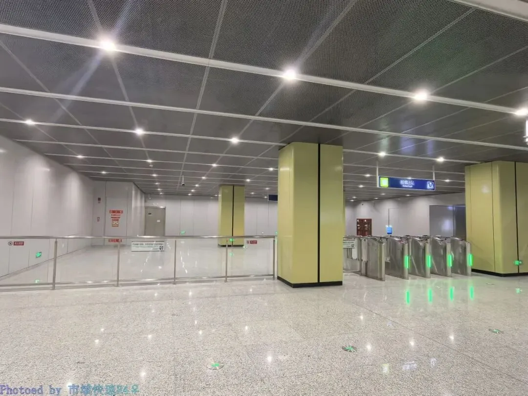 机场跑道旧址站站厅层,将机场跑道轨迹化为天花核心视觉语言,通过动感曲线造型与嵌入式灯光系统交织,塑造出富有流动感与未来感的立体空间,生动诠释城市的能量与速度