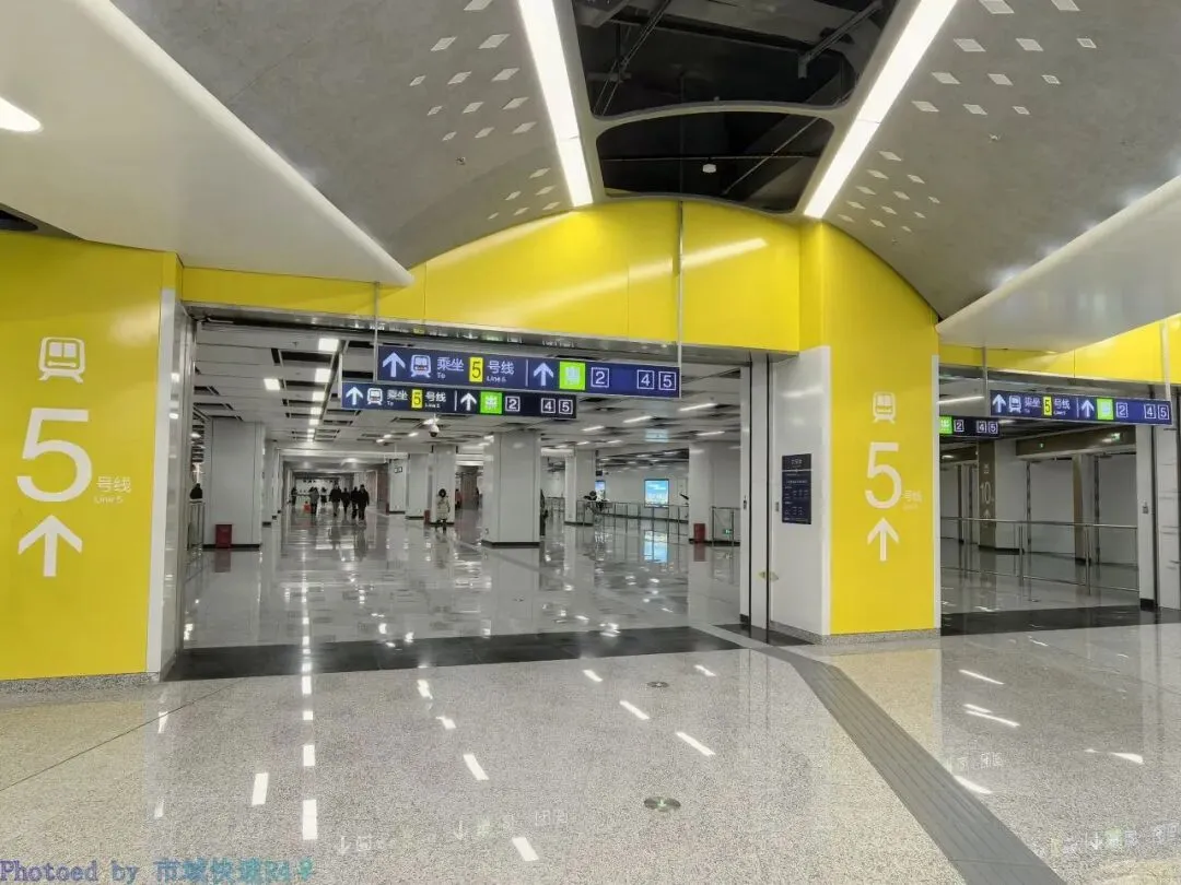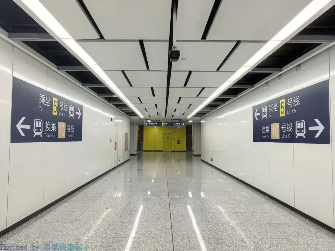 大校场站为5、10号线换乘站,两线构成钝角V字换乘,节点连接10号线站台东侧与5号线站台西侧,几乎呈一直线