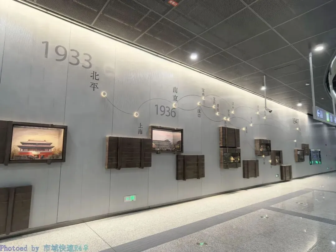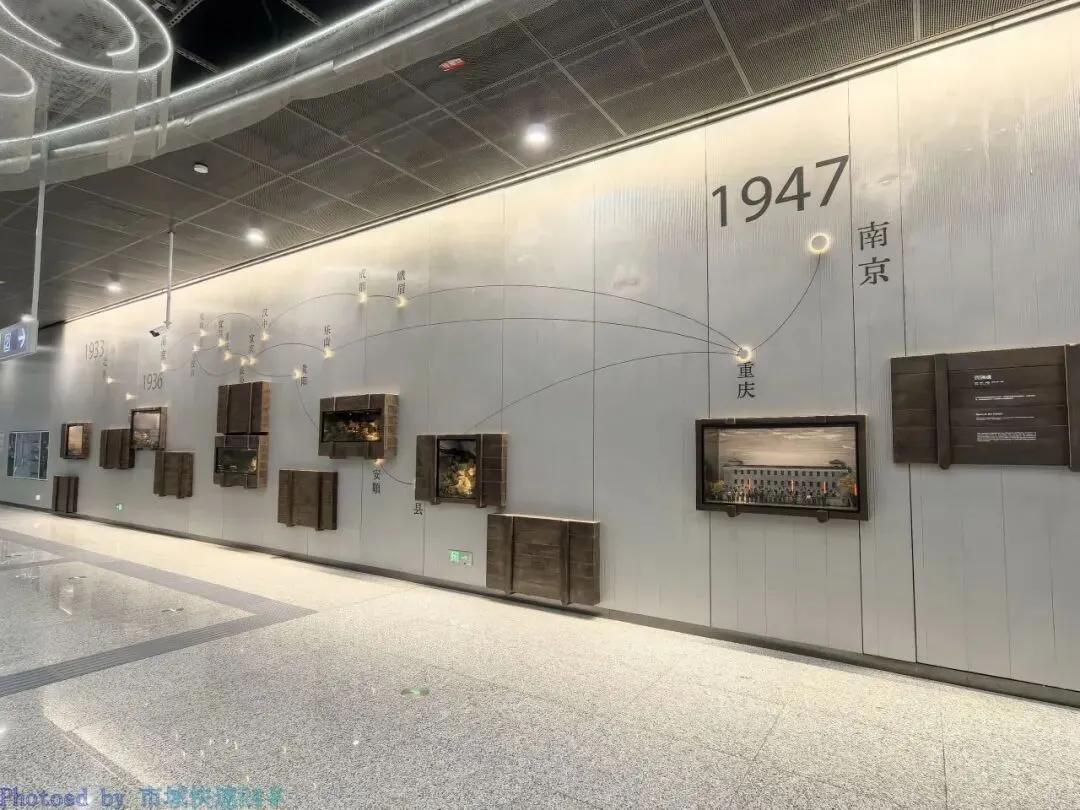 雨花台站站厅层设计主题:延展中的底蕴提取雨滴形态作为设计元素,运用模块化线条与灯光营造红色文化氛围,诠释红色精神在当代的存续与焕新