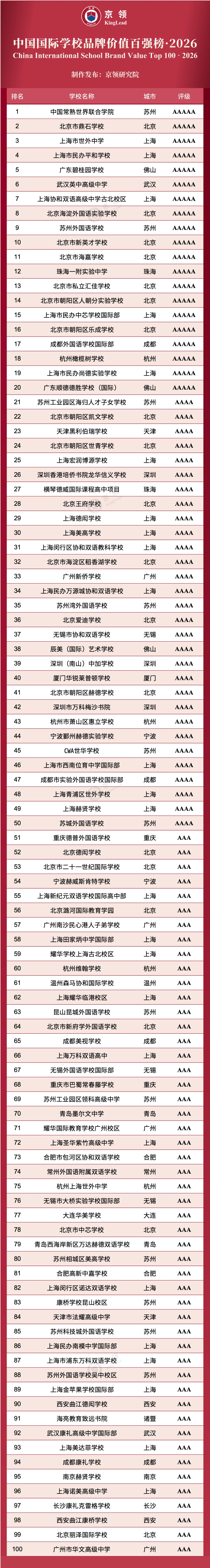 近日,京领2026中国国际学校品牌价值百强榜正式发布,作为国际教育领域极具权威性的榜单,其评估体系涵盖认证竞争力、师资竞争力、社会影响力、可持续经营及行业影响力五大核心维度,今年更新增“可持续经营”一级指标,全面彰显学校品牌积淀与发展潜力。