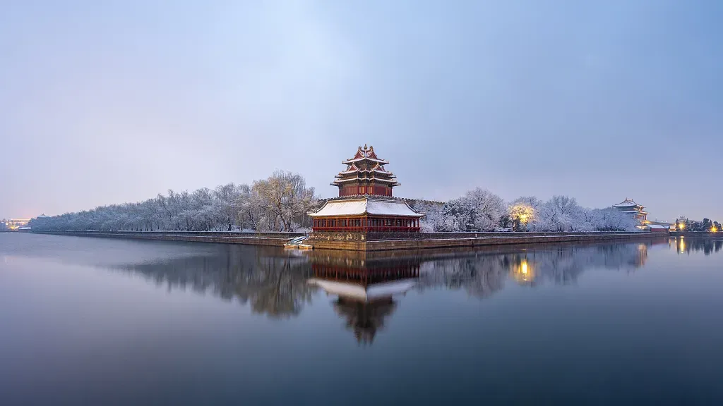 ▲大地就像是被千万朵摇落的洁白花瓣铺满。树梢上的云层散去,远处山影渐渐显现,月亮慢慢升到屋檐,照亮了层层叠叠的楼阁。