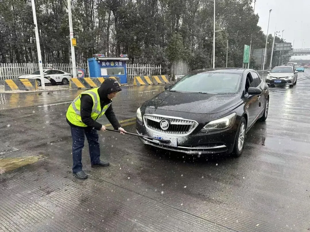 随着雪势加剧,工作人员加强对收费站车道、服务区进出口及广场等加强积雪结冰清扫工作,针对早高峰时段积雪覆盖车牌导致识别失效的问题,收费站工作人员手持工具俯身清理车牌积雪,既提升了道口通行效率,也赢得了司乘人员的连连好评,成为风雪中的暖心风景。