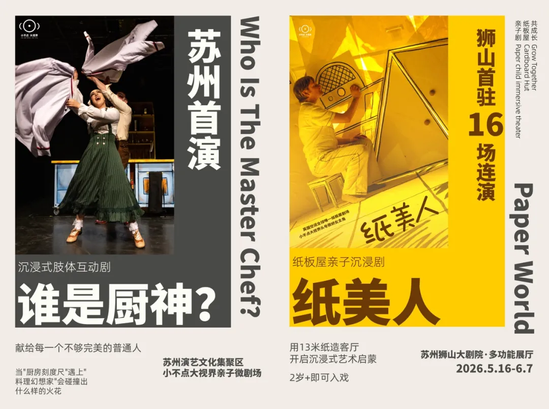《谁是厨神?》将在苏州演艺文化集聚区小不点大视界亲子微剧场爆笑上演,邀请大小朋友在笑笑闹闹叮铃哐啷中品尝人生四季的滋味。温暖治愈的《纸美人》则将在狮山大剧院温暖返场,邀请你到她的纸世界做客,和色彩玩出一个美丽新世界。