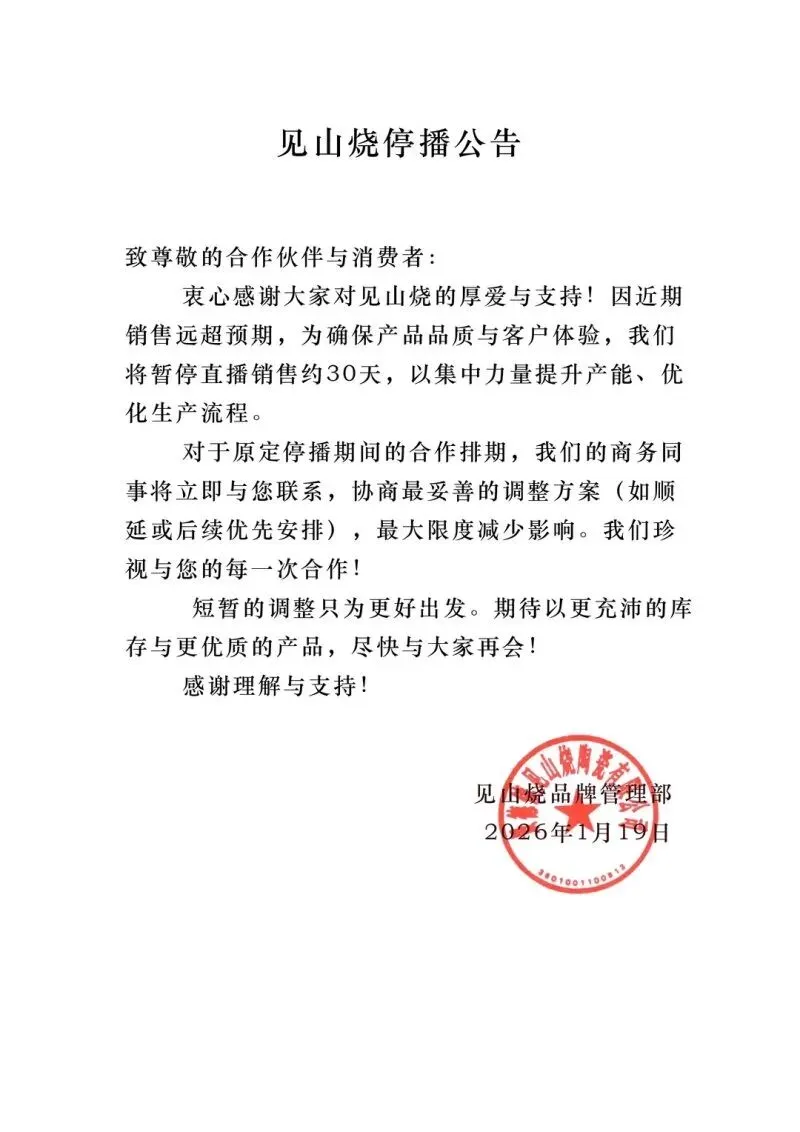 记者注意到,“见山烧”在公告中明确表示,此次停播源于近期产品销售业绩远超预期,为保障产品品质不受影响、持续优化客户体验,品牌将集中资源提升产能、完善生产流程,待储备更充沛库存与更优质产品后再恢复直播。